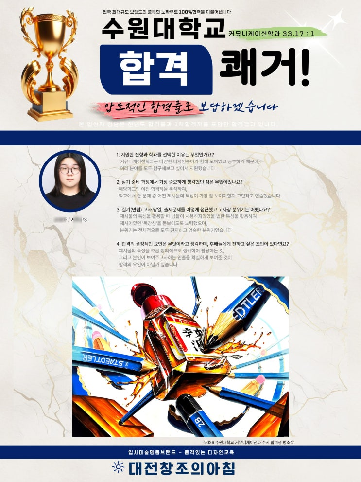 수원대학교 실기 수시 최초합격! 박살냈다 경쟁률 34:1을 뚫은 진짜 이야기 지금 시작합니다~! 안녕하세요. 대전창조의아침 미술학원입니다. 이번 결과는 그냥 합격이 아니였는데요!! 수원대학교 커뮤니케이션학과 무려...경쟁률 34:1에 육박!!! 그리고 실기 수시 최초합격 그런데 여기서 더 놀라운 사실이 있다는것!!!!! 내신 7등급. 네, 7등급입니다. 많은 학생과 학부모님들이 이렇게 묻습니다. “내신이 낮은데 가능할까요?” “7등급이면 현실적으로 어렵지 않나요?” 이번 합격생이 그 질문에 답을 해줬습니다. 의문을 결과로 만들어주었고, 그 데이터베이스가 또한번 대전창조의아침에 쌓였습니다. 증명했습니다. 내신 7등급, 그러나 결과....... <img src="https://blogthumb.pstatic.net/MjAyNjAyMjBfNjEg/MDAxNzcxNTgzNjgwNTIx.TjdLlcrJUPXcmA4E_7LQbiPdPltihfuRD37bGMdFbQkg.JFeXJdmXv9u0Jspkbon_VgnFGWuqyZ-tqvPQqhN-ODQg.JPEG/004.jpg?type=s3" />