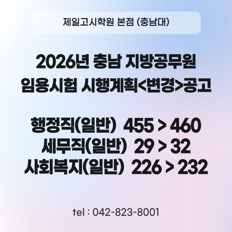 안녕하세요 !!! 제일고시학원 본점 입니다 : ) 오늘 전해드릴 소식은 2026년 충남 지방공무원 임용시험 시행계획 변경 공고 안내입니다. 일반행정직(일반) 455명 > 460명 세무직(일반) 29명 > 32명 사회복지(일반) 226명 > 232명 자세한 지역별 채용인원은 사진을 첨부해두었으며 저희 제일고시학원에서는 사진스캔 서비스, 그리고 추후에 응시표 출력을 도와드리고 있습니다. 도움이 필요하면 3층 상담실로 방문해주세요! 4월에 있을 국가직부터 6월 지방직까지 얼마남지않았습니다. 마지막이다라는 생각으로 준비하셔야하는데요 그렇기에 저희 제일고시학원에서는 단원별 필수 문제풀이가 진행중입니다 ! 4월부터 있을 국가직 시험을....... <img src="https://blogthumb.pstatic.net/MjAyNjAzMDlfODYg/MDAxNzczMDMzMTM2Mjk0.6t1bD5Ms667zx97G43Y0vhubzmmyHZLRQ-PMQo_hDxMg.h9js7joTTtl4Av94NWKD0Sw-c9IQpsFg62CG-Mt62Mog.PNG/%C1%A6%B8%F1%C0%BB-%C0%D4%B7%C2%C7%D8%C1%D6%BC%BC%BF%E4_-001_%285%29.png?type=s3" />