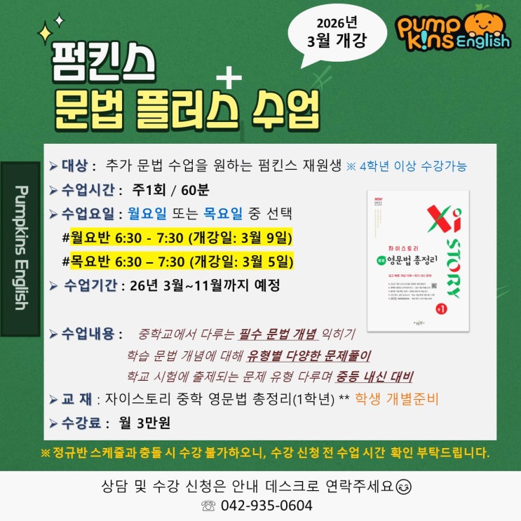 안녕하세요, 펌킨스 잉글리쉬입니다. 펌킨스에서는 매년 신학기 4학년 이상 재원생을 대상으로 ‘문법 플러스 수업’을 진행하고 있습니다. 수업 안내 #대상 : 펌킨스 재원생 (4학년 이상) #수업 시간 : 주 1회 / 60분 #수업 요일 : 월요일 또는 목요일 선택 월요반 6:30-7:30 (3월 9일 개강) 목요반 6:30-7:30 (3월 5일 개강) #수업 기간 : 2026년 3월 ~ 11월 예정 #수강료 : 월 3만원 수업 내용 ✔ 중학교 필수 문법 개념 완성 ✔ 개념별 유형 문제풀이 훈련 ✔ 학교 시험 출제 유형 대비 ✔ 중등 내신 대비 기반 다지기 ※교재 : 자이스토리 중학 영문법 총정리(1학년) / 수강 학생 개별 준비 " 이런 학생에게 추천합니다....... <img src="https://blogthumb.pstatic.net/MjAyNjAyMjRfNDkg/MDAxNzcxOTE3ODMxMDcy.fhgkqGz_TKiEN5o70O_hPi2R7OBXO4eUqQQQ5PH6xBwg.Kf9tbMFp_-Y7rPRVrKsGkxBAB6w6sUOKyuKx0mLrogMg.JPEG/%B9%AE%B9%FD_%C7%C3%B7%AF%BD%BA_2026.jpg?type=s3" />