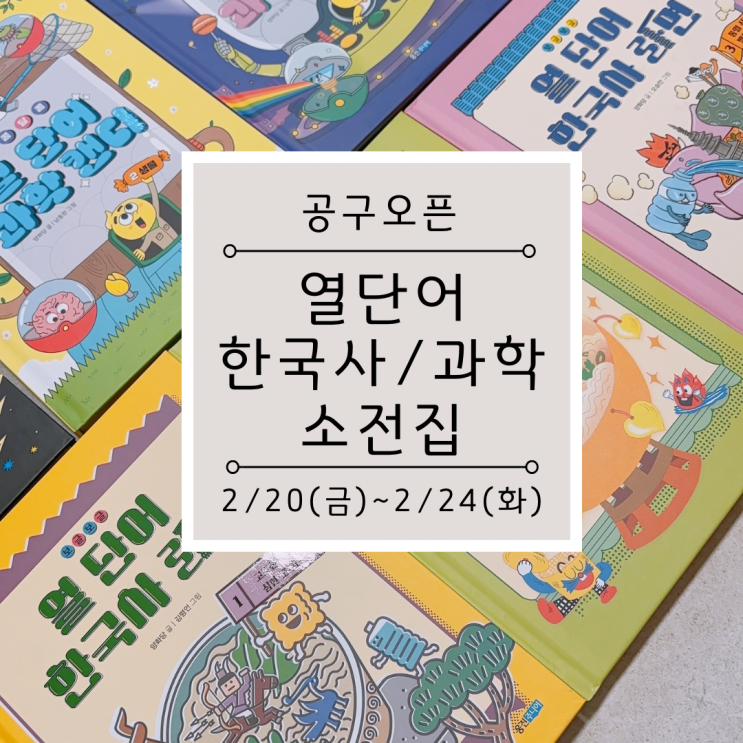 엄마, 나 사회랑 과학이 어려워... 실제 저희 첫째가 작년에 한 말이예요! 사실 사회랑 과학이 이렇게 어려울 줄 몰랐어요! 그런데 교과서를 보니 개념들이 많이 나오더라구요! 아마 사회, 과학 어려워하는 아이들 많을거예요! 그래서 준비한 소전집!! 바로 웅진에서 나온 "열단어" 시리즈예요! 심지어 공구 가격도 너무 좋아요! ✅ 공구 기간 2/20(금)~2/24(화) ✅ 공구가 ✔ 열단어 한국사 라면 (전 4권) 56,000-> 39,200원 ✔ 열단어 과학 캔디 (전 5권) 70,000-> 49,000원 ✅ 배송 ✔무료 배송 ✅ 공구 링크 *꼭 쿠폰 적용해주세요! https://item.gmarket.co.kr/Item?goodscode=4516317688 단 10개의 키워드로 풀어내는....... <img src="https://blogthumb.pstatic.net/MjAyNjAyMDZfMTY2/MDAxNzcwMzUyOTQ2NjE2.rhEghyoLnzPdXCoua51h7CfkO3oog1CLfHDnKXvB_UMg.lAmY1Gzews9jPFfhT-YpWF5T8EfZA6BU-_p-28RMLxIg.PNG/KakaoTalk_20260206_134138425.png?type=s3" />