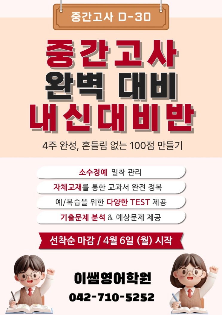 어느덧 중학교 1학기 중간고사가 한 달 앞으로 다가왔습니다. 첫 시험에서 좋은 성적을 받는 것은 단순히 성적 이상으로 성취감, 영어에 대한 자신감 향상에 매우매우 중요합니다. 따라서 1학기 중간고사 성적이 한 해의 내신 흐름을 좌우하기도 합니다. 확실한 성적 향상을 위해 이쌤영어학원에서 '중간고사 완벽 대비 내신대비반'을 본격적으로 시작합니다. [4주 완성, 흔들림 없는 100점 만들기] 단 4주, 어설픈 벼락치기가 아닌 탄탄한 실력으로 100점을 완성하는 골든타임입니다. 이쌤영어학원 내신대비반의 4가지 핵심 무기 1. 소수정예 밀착 관리 학생 한 명 한 명의 학습 상태와 취약점을 정확하게 파악하고 빈틈없이 지....... <img src="https://blogthumb.pstatic.net/MjAyNjAzMjlfMzQg/MDAxNzc0Nzg0MDA0NDkz.FrJ4kISEzoWXAb8aIbpn6dLRSWYmpJM7L-DLIwK8FVMg.2izTipc506K6rppP3eMnvdZH7XS6A4J7PlR43R5G7xEg.JPEG/%C1%A6%B8%F1%C0%BB_%C0%D4%B7%C2%C7%D8%C1%D6%BC%BC%BF%E4..jpg?type=s3" />