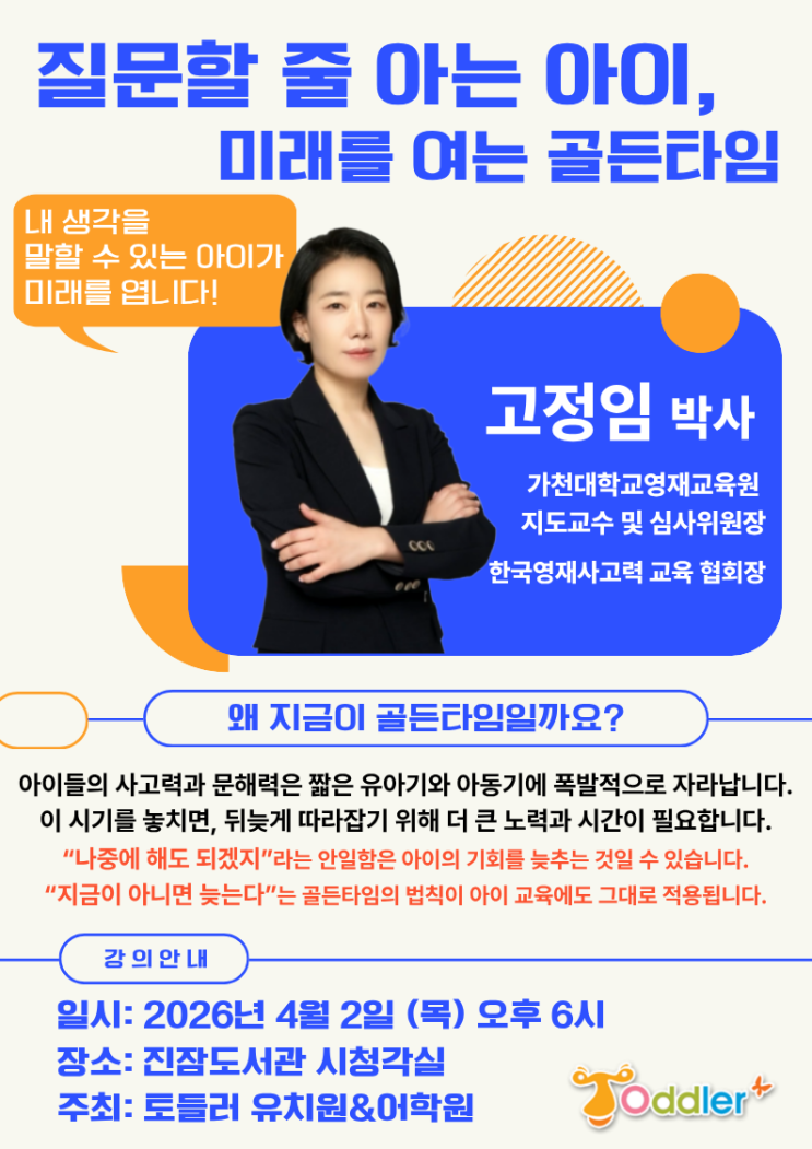 안녕하세요, 토들러 유치원&어학원입니다. 매일 아이들의 밝은 웃음과 함께하며, 우리 아이들이 건강하고 행복하게 성장할 수 있도록 최선을 다하고 있습니다. 항상 토들러를 믿고 사랑해 주시는 학부모님들께 진심으로 감사드립니다. 오늘은 학부모님들께 특별한 강연 소식을 전해드리려 합니다. 아이의 미래를 위한 단 한 번의 골든타임, 절대 놓치지 마세요! 왜 지금이 골든타임일까요? 부모라면 누구나 바랍니다. 아이가 스스로 생각을 정리하고, 궁금한 것을 당당히 질문하며, 자신의 이야기를 자신 있게 표현하는 힘을 가지길. 그런데 그 힘은 그냥 생겨나지 않습니다. 바로 지금, 이 시기에 올바른 교육을 경험하는 순간에....... <img src="https://blogthumb.pstatic.net/MjAyNjAzMzFfMzQg/MDAxNzc0OTIzMTA3Mzky.2Supzd0NvBeX6t07gvu_2k5gEO9kkeg5c8c1CF4DaSIg.BOWar-MiUtsKJrZDRMABbowoQMh5aXzXFFT8yKcm-hYg.PNG/KakaoTalk_20260327_104227025.png?type=s3" />