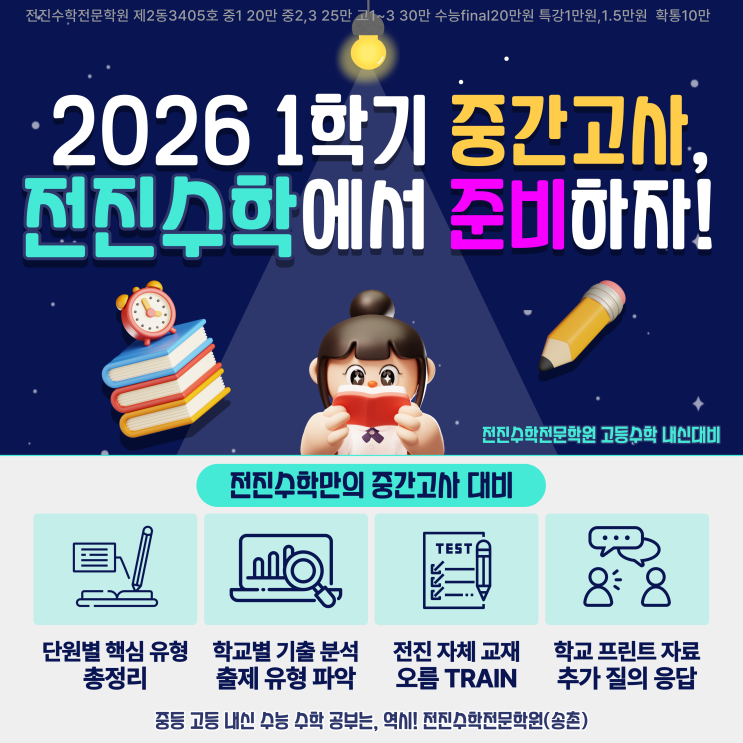안녕하세요! 전진수학전문학원 송촌원입니다~ 3월 개학을 시작으로 중간고사를 앞두고 있는 모든 학생들을 응원합니다! :) 4월 말 치뤄지는 2026년도 1학기 첫시험 중간고사를 위한 도전! 전진수학 송촌원이 함께합니다. 전진수학전문학원은 각 학교별 시험기간 & 시험범위 & 학생의 목표와 수준에 따른 맞춤형 수업을 진행합니다. #명석고 #송촌고 #동대전고 #우송고 #대전여고 전진수학 고등 내신대비 전진학원 자체 교재 '오름' 트레인 학생들이 학습한 내용을 문제풀이를 통해 복습하고 중요한 문제들은 반복적으로 학습할 수 있도록 전진만의 자체교재를 사용합니다! (전진학원 본원 동일 교재) 3월 중 제공 예정! 수준별....... <img src="https://blogthumb.pstatic.net/MjAyNjAzMTRfMjQz/MDAxNzczNDUxNjkyMjgy.NLltelGzC36DiDAht37E8_9h0uWPDnsU9KGc67eBuP4g.S1cPwcgTOz7l0ZmaBz7b-wR8687k26u_Ok29bdT7apEg.PNG/image.png?type=s3" />