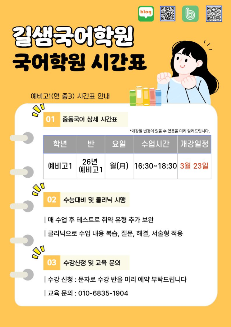 [길샘국어 예비고1(현 중3) 국어 시간표 안내] 안녕하세요, 길샘국어학원입니다. 중3 아이들이 고등 국어를 미리 완벽하게 대비할 수 있도록 예비고1 정규반을 개강합니다. 상세 시간표 대상: 예비고1 (현 중3) 개강: 3월 23일(월) * 개강일에 변동이 있을 수 있음을 미리 알려드립니다. 시간: 매주 월요일 오후 16:30 ~ 18:30 < 길샘국어 시기별 핵심 커리큘럼 > 1-2개월 차: [기초] 하루끝 기본 국어 (국어 전 영역 기본 개념 정립) 3-6개월 차: [고전] 하우투 고전 & 고전문학 바이블 (고전 시가·산문 독해법) 7-8개월 차: [독서] 독서는 독해력 (영역별 지문 패턴 및 문제 유형 익히기) 9-10개월 차: [문법] MY기본 문법 (문법 전....... <img src="https://blogthumb.pstatic.net/MjAyNjAzMTFfMTU0/MDAxNzczMTk0MTc3NjYy.PO_UVMbVwv93b4TStnyQ9w6183cjDGuwzCEqxT5qDPUg.6Ifb3zSDfl2xEFelAWsK6CbGCcdBczLV6uJ_yd35n4Ug.PNG/image.png?type=s3" />
