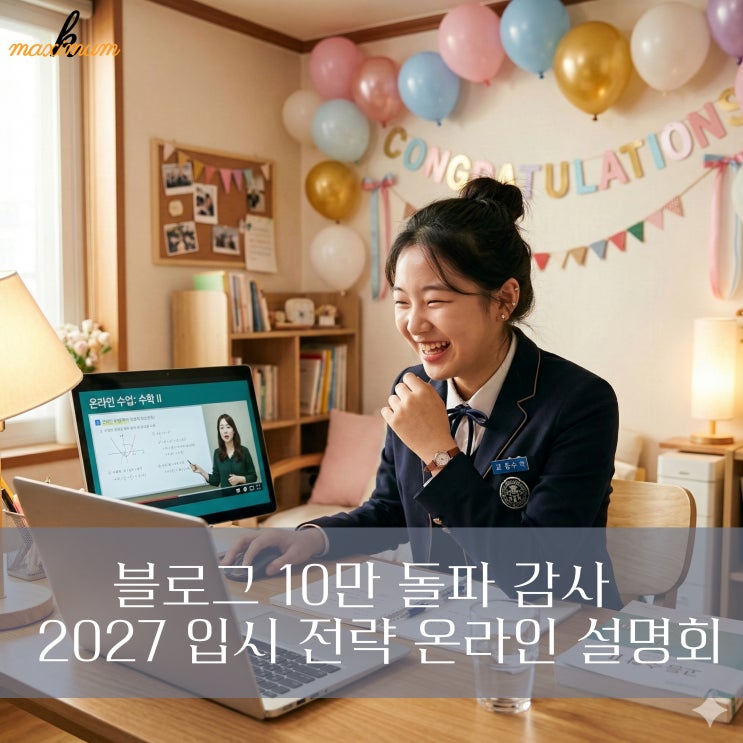 안녕하세요. 대전 목동에서 충남여중 충남여고를 주력으로 고등 수업과 입시컨설팅을 하는 K선생님 인사드려요! 여러분 덕분에 블로그 방 문자 수가 10만을 돌파했습니다. 입시 정보가 넘쳐나는 시대에, K선생을 찾아주시고 믿어주신 덕분입니다. 진심으로 감사드립니다. 이 감사함을 어떻게 전할까 고민하다가, 가장 K선생다운 방법을 선택했어요. 바로 2027 입시 전략 온라인 설명회를 무료로 준비했습니다. 전국 어디서든 참여할 수 있어요! 1. 설명회 개요 — 3월 21일, ZOOM에서 만나요 먼저 설명회 핵심 정보부터 정리해 드리겠습니다. 일시: 2026년 3월 21일(토) 오후 2시 장소: ZOOM 온라인 (신청자에게 개별 링크 발송) 대상: 전국 고등....... <img src="https://blogthumb.pstatic.net/MjAyNjAzMDlfNTgg/MDAxNzczMDU3ODA4MjI5.3jTjPusEVwcna5-xEABP2zl40rp2Yub9X0vOGcbuQEUg.MiroxfGBRoGWMytiknl4Sh12tH50rlAlsudr3mBAA00g.JPEG/%C1%A6%B8%F1%C0%BB-%C0%D4%B7%C2%C7%D8%C1%D6%BC%BC%BF%E4_-037.jpg?type=s3" />
