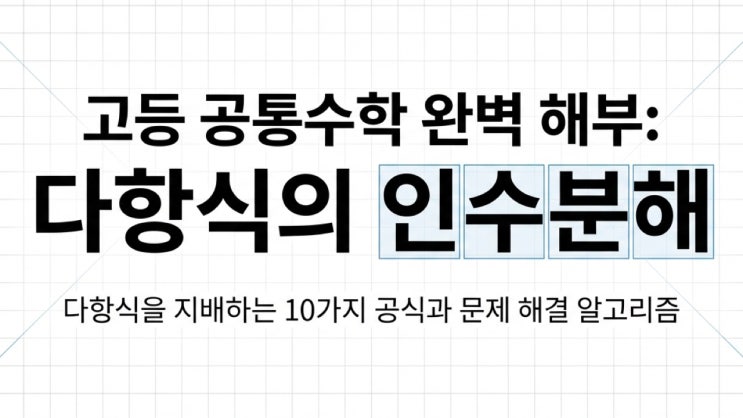 고등수학의 다항식의 인수분해 10가지 공식과 문제해결 끝판왕 모형을 완성했습니다. 2차원적인 개념설명에서 3차원 공간감을 추가했습니다. 인수분해의 본질과 시작 완전제곱식 합차공식 복이차식 특수형태를 알아채는 눈-치환법, 변형법 인수분해 해결방법 결정을 어떻게? 같은 개념 다른해석 2차원 평면학습에서 3차원 입체적인 인수분해 설명과 학습 어떠셨나요? 댓글 응원의 좋아요는 큰 힘이 됩니다. 아내와 쇼핑나와서 까지 핸드폰로 하려니 텍스트 입력이 힘드네요.~~ <img src="https://blogthumb.pstatic.net/MjAyNjAzMTRfMjgz/MDAxNzczNDU3NDkxODU0.oQKpN2dnJfu2kYiB7vWdoGQaC3-nA2yLg7hi4RCswmkg.MF5Z60FUkMBIcIyGO_r4nEqGwilrGcbanXXV0QiIze4g.JPEG/%B4%D9%C7%D7%BD%C4%C0%C7%C0%CE%BC%F6%BA%D0%C7%D8%28%BF%CF%B0%E1%C6%ED%29.001.jpeg?type=s3" />