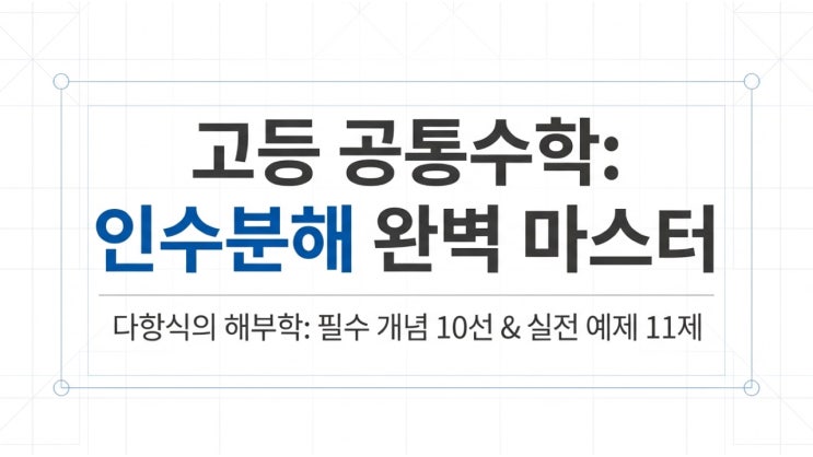 1. 모든 인수분해의 절대 규칙: 제1원칙 어떤 복잡한 다항식을 만나더라도 가장 먼저 해야 할 일은 '공통인수(Common Factor)'를 찾는 것입니다. 공통인수가 있다면 다른 어떤 공식보다 우선하여 묶어내는 것이 인수분해의 절대 규칙입니다. 2. 2차식 마스터: 기본 3유형 2차식의 인수분해는 크게 세 가지 패턴으로 나뉩니다. 합차 공식 (Difference of Squares): '제곱의 차'는 '합'과 '차'의 대칭 구조로 분할됩니다. 완전제곱식 (Perfect Squares): 양 끝 항이 제곱수 형태라면 가운데 항이 크로스 다이얼그램 (일반 삼항식): 최고차항과 상수항을 두 수의 곱으로 쪼갠 후, 대각선(Cross)으로 곱해 더....... <img src="https://blogthumb.pstatic.net/MjAyNjAzMTVfMjA3/MDAxNzczNTQ5OTI3ODgy.v7cQSyUuSzd5eTWCkAmuoo19YFRMUjX6DWbYxmUUukIg.-22D-Fp5bt6W6mahlxtMyWTAHwuXmULbPOWeEr4lQSwg.JPEG/%C0%CE%BC%F6%BA%D0%C7%D8%C7%CA%BC%F6%B0%B3%B3%E410%BD%C7%C0%FC%BF%B9%C1%A611%C1%A6.001.jpeg?type=s3" />