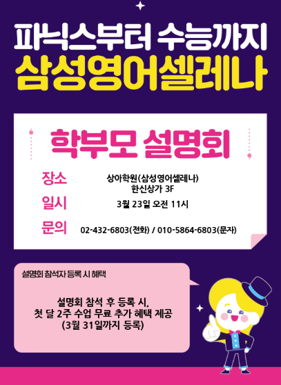 중화동 상아영어학원 파닉스부터 수능까지 삼성영어셀레나 학부모 설명회 안내