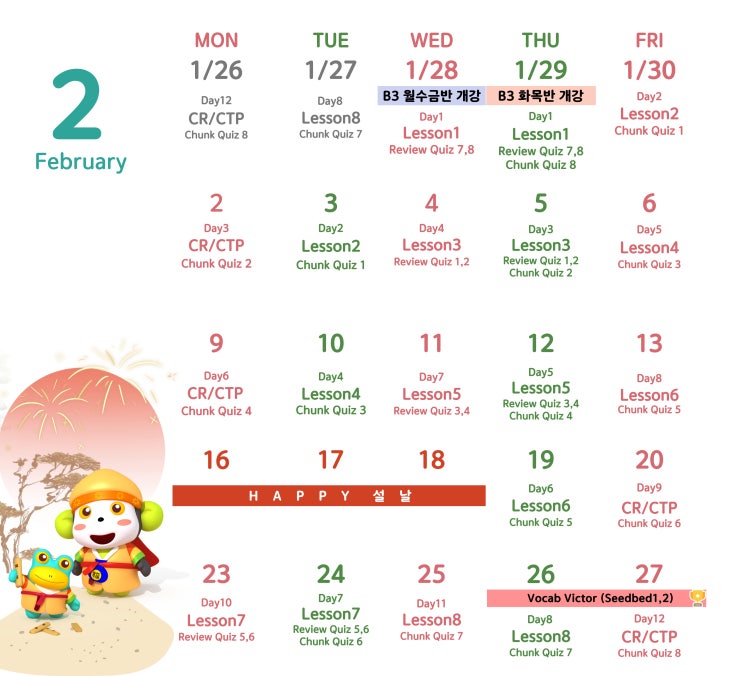 25' 겨울학기 2월(B3) NEWSLETTER 안녕하세요, April어학원입니다 :) 25학년도 겨울학기 2월(B3) 학사일정 및 이벤트 안내드립니다. 1. 겨울학기 B3 (2월) 등록기간 및 교재 구매 기간 · 1월 14일(수) - 1월 23일(금) 2. 겨울학기 B3 (2월) 수강 기간 (교재 사용 기간) ·월수금 반: 1월26일(월) - 2월 27일(금), 총 수업 12회 · 화 목 반: 1월 27일(화) - 2월 26일(목), 총 수업 8회 3. 겨울학기 2월(B3) 학사 일정 4. 겨울학기 B3 (2월) 시험 일정 ① Review Quiz - 해당 Level : Seedbed 1,2 매주 1회, 지난주에 배웠던 레슨에 대한 복습 퀴즈 입니다. 총 10문제로 구성되어있으며 Vocabulary 8문제 + Sentence 2문제 를 시험보게 됩니다....... <img src="https://blogthumb.pstatic.net/MjAyNTEyMDZfMjM3/MDAxNzY0OTk4NTQ1MzEz.6jBmkTGlAOmelLADo9td11R0oA3tO9QbF5r-ymXAFCQg.6A0VnE-Omt1v4KgWkAfRTvjUWxl_Nu4JMae-J1Ytazgg.JPEG/25%B3%E2%B5%B5-%B4%BA%BD%BA%B7%B9%C5%CD-014.jpg?type=s3" />