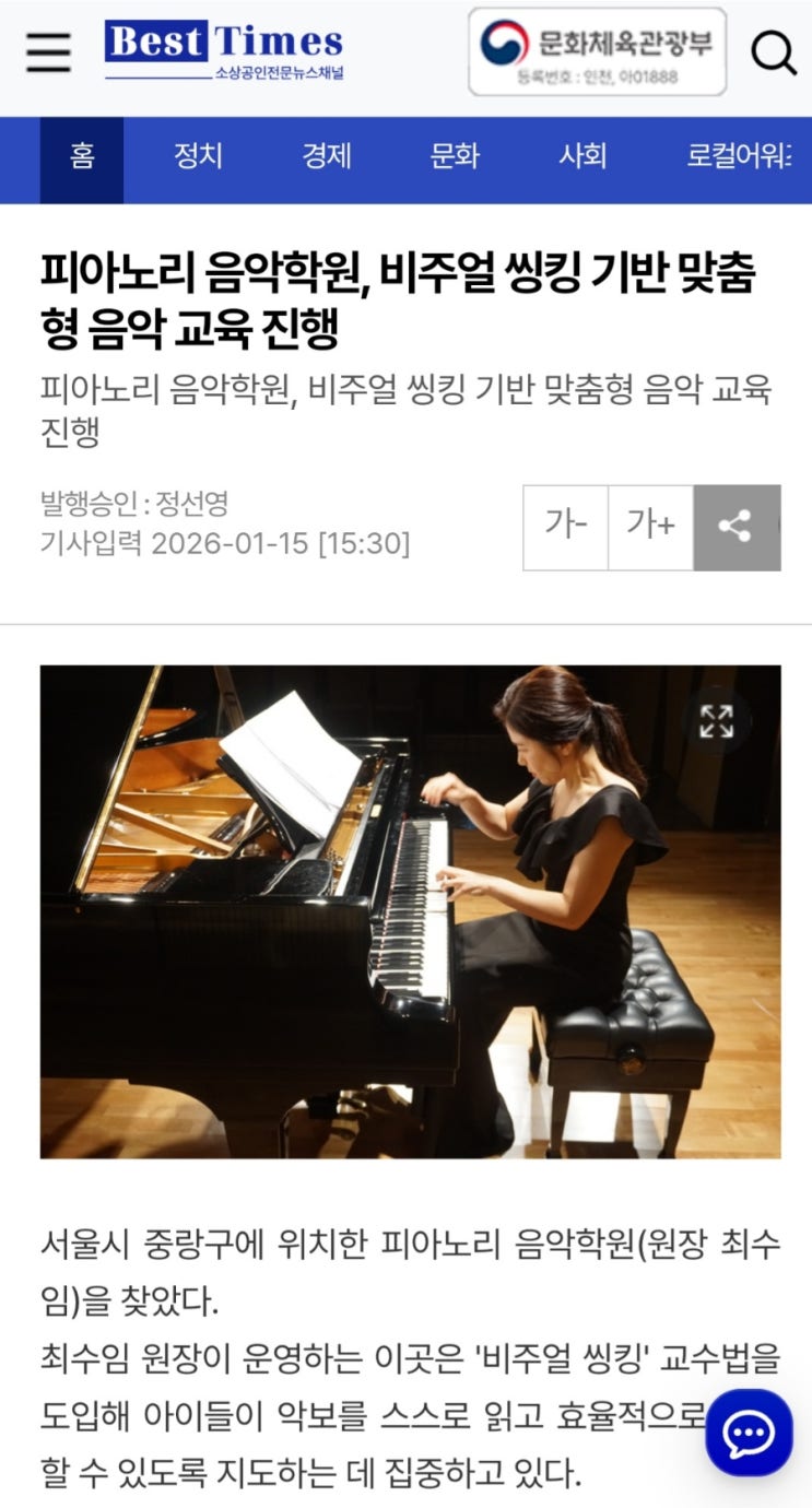 피아노리 음악학원은 아이들이 악보를 보다 쉽고 정확하게 읽을 수 있도록 지도하는 수업 방식과 효율적인 연습 방법, 그리고 체계적인 관리 시스템을 긍정적으로 평가받아 신문사 측의 제안으로 인터뷰 취재가 진행되었습니다. 단순히 진도를 나가는 수업이 아니라, ✔️ 음을 하나하나 외우는 방식이 아닌 악보를 이해하며 읽는 지도 ✔️ 무작정 오래 연습하는 것이 아닌 시간 대비 효과적인 연습 방법 지도 ✔️ 집에서의 연습 방향까지 연결되는 개인별 연습 관리 이러한 수업 과정을 좋게 봐주셔서 기사로 소개되었습니다. 신문사 인터뷰 기사 ▶ https://m.primeherald.co.kr/19417 ▶ https://m.besttimes.co.kr/6067 아이를 맡기는....... <img src="https://blogthumb.pstatic.net/MjAyNjAxMjFfMjI1/MDAxNzY4OTY5MjE4Mjgz.xiOjsPLmSkSDq2W1feWmRN8GTpa3j8ql5L9_achELicg.3imBbaEG_Q_H5znKSlNTDWgNjQZr5P7rwSRYnNuoZDMg.JPEG/900%A3%DFScreenshot%A3%DF20260121%A3%DF124638%A3%DFNAVER.jpg?type=s3" />
