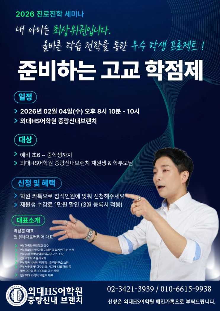 안녕하세요, 외대HS어학원 중랑신내브랜치입니다. 최근 입시 제도의 가장 큰 화두는 단연 **고교학점제**죠. "우리 아이가 예비 초6인데, 중학생인데... 벌써 준비해야 할까요? " 라는 질문을 정말 많이 받습니다. 결론부터 말씀드리면, 네, 지금이 골든타임입니다. 내 아이를 최상위권으로 만드는 전략, 혼자 고민하지 마세요. 입시 전문가 박성훈 대표님과 함께하는 특별 세미나에 학부모님들을 초대합니다 ! 이번 세미나, 왜 꼭 들어야 할까요? 1. 준비하는 자만이 살아남는 '고교학점제' 변화하는 교육 과정 속에서 올바른 학습 전략이 없으면 우수한 학생들도 길을 잃기 쉽습니다. 이번 세미나에서는 고교학....... <img src="https://blogthumb.pstatic.net/MjAyNjAxMjZfMTcg/MDAxNzY5NDI4NTQyNDk2.BZWsN28GVD6g3omxEUxVrWcjovfSxFLC8uHLs6bkzzog.YEW-5_aQckvOAHovP40tapZwOySxO9CJh6qW424ltEMg.JPEG/0204_%C1%F8%B7%CE%C1%F8%C7%D0_%BC%BC%B9%CC%B3%AA.jpg?type=s3" />
