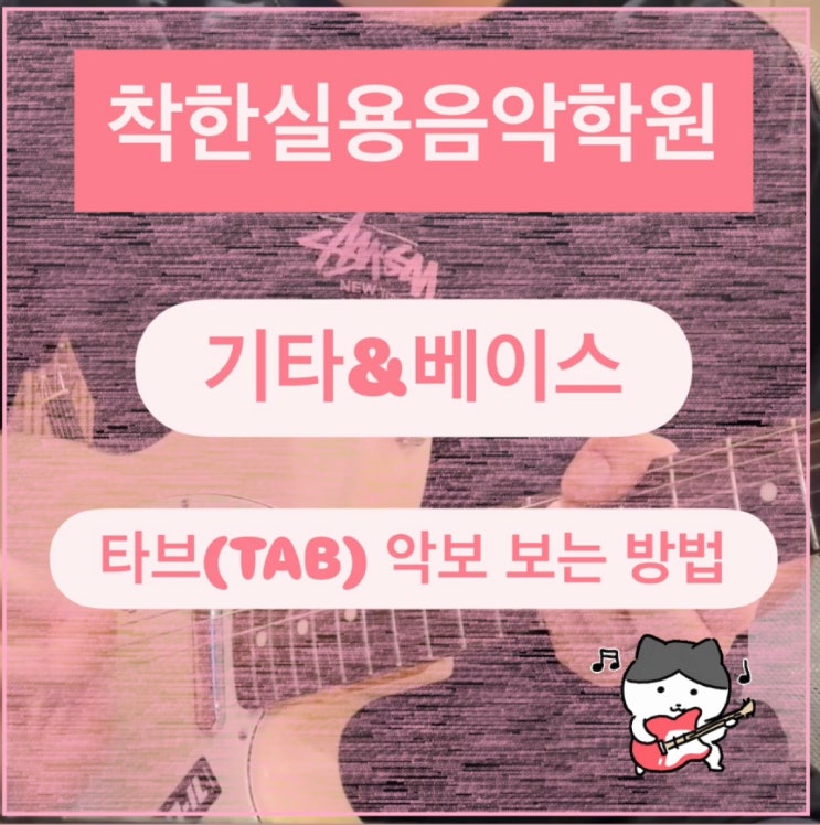 베이스·기타 타브(TAB) 악보 보는 방법 타브(TAB)악보는 Tablature 의 줄임말 입니다. 음악 이론을 몰라도 연주를 시작할 수 있도록 만들어진 악보입니다. 다만, 헷갈리는 부분이 있어 어렵게 생각하는 사람들이 많습니다. 착한실용음악학원에서 베이스기타 초보자, 베이스 입문자도 타브 악보를 볼 수 있도록 쉽게 설명 드릴테니 눈 여겨 봐주세요! ---------------------------------------------------------------------- ✨착한실용음악학원은 22년 전통의 음악나눔 역사를 이어오고 있습니다. 입시/취미/오디션 월15만원 02.977.4005 (방문상담 예약) 010.5287.6665 (친절 상담) 연중무휴(설날, 추석 3일 제외) / 주차장 보유 베이스....... <img src="https://blogthumb.pstatic.net/MjAyNTEyMzBfOTQg/MDAxNzY3MDk1ODc1Mjc0.4T33L8BFlRZqrvW5FXRbOsmW33un-rvgW5C-WP6Bl7kg.VGSQ8lZs3NrqcI1KlEUNa5YQkOVoP7kLE2zJ2VViZwsg.JPEG/%B1%E2%C5%B8%BA%A3%C0%CC%BD%BA.jpg?type=s3" />