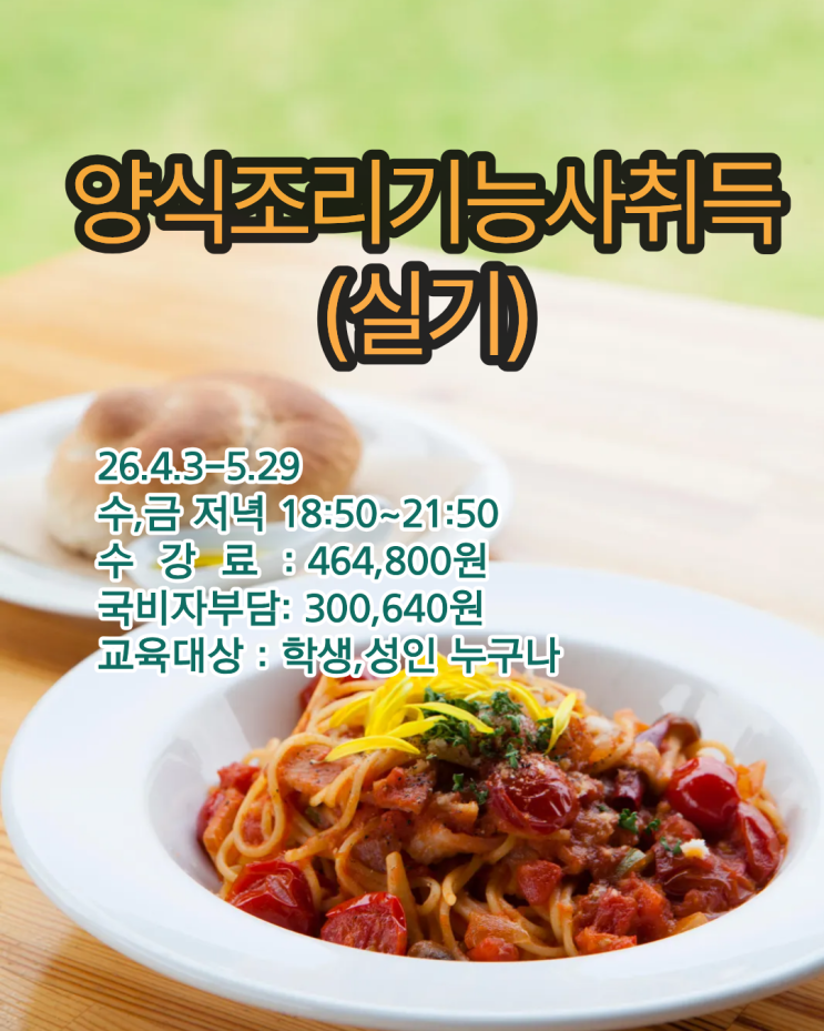 4.3 수금저녁 양식조리기능사취득(실기) 울산에서 양식조리기능사 자격증 취득을 준비하시는 분들을 위한 양식조리기능사 실기 과정 수강생을 모집합니다. 요리를 처음 시작하는 분들도 쉽게 따라올 수 있도록 기초부터 시험 대비 실기까지 체계적으로 지도합니다. 실기 시험에 필요한 메뉴와 조리 방법을 집중적으로 배울 수 있습니다. 교육과정 안내 교육기간 : 2026년 4월 3일 ~ 5월 29일 수업시간 : 수·금 저녁 18:50 ~ 21:50 교육대상 : 학생 · 성인 누구나 요리 자격증 취득을 준비하거나 요리를 전문적으로 배우고 싶은 분들에게 추천드립니다. 울산 요리학원 김은경 기능장 요리학원 #울산요리학원 #울산조리학원 #울산양식조리기능사 #양....... <img src="https://blogthumb.pstatic.net/MjAyNjAzMTVfMjE0/MDAxNzczNTgxNjY3OTA2.BPHIXDRfXb3KYK7j2h02b43c61i96bnWXfVRTHRHzVsg.Xa_jWedoLUx4Dd5j_bKXDyyry-4BhSwNadNso39BR4gg.PNG/%C1%A6%B8%F1%C0%BB_%C0%D4%B7%C2%C7%D8%C1%D6%BC%BC%BF%E4._%2842%29.png?type=s3" />