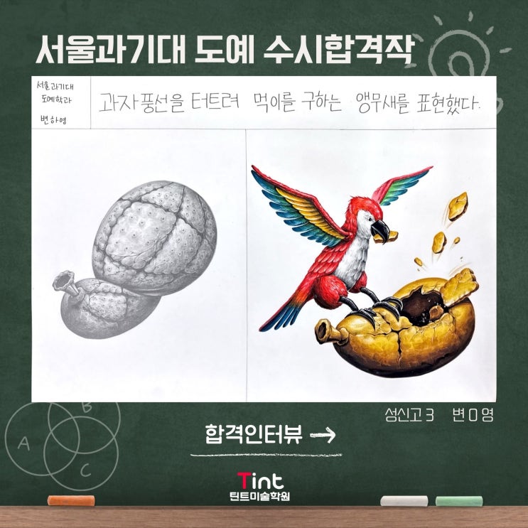 안녕하세요, 울산틴트미술학원입니다. 오늘 포스팅할 내용은 서울과학기술대 도자공예 수시합격생 인터뷰입니다. [홍익대 도자유리공예 합격] [서울과기대합격 도자 합격] 수시 2관왕!!! Q. 출제문제를 읽고 어떻게 풀어 나갔나요? A. 문제의 방향이 예상과 다르게 출제되어 순간적으로 당황했지만, 주제인 새가 날아와 과자 질감의 풍선을 터트리는 장면을 직관적으로 담는 방향으로 구성하였습니다. 소묘에서는 둥근 덩어리감과 비틀린 형태를 집중적으로 표현했습니다. 소묘와 디자인 문제 모두 화려하거나 과도하게 새로운 연출보다는 학과의 특성에 맞게 제시된 상황 표현과 과자, 새의 털 등 질감을 세밀하게 묘사하는 데 중점을 두어 그림....... <img src="https://blogthumb.pstatic.net/MjAyNjAxMTNfMjUg/MDAxNzY4MzEzNjY2NjEz.KQQ7WQMtbbH1bltlLCjGdFKntoJYthnlwXiOasOqLNog.-kcSJ7HIFJauLH-91cL6V6VDLlM86jJtW9GToBrztLwg.JPEG/%BC%AD%BF%EF%B0%FA%B1%E2%B4%EB_%B5%B5%C0%DA_%BA%AF%C7%CF%BF%B5_%281%29.jpg?type=s3" />