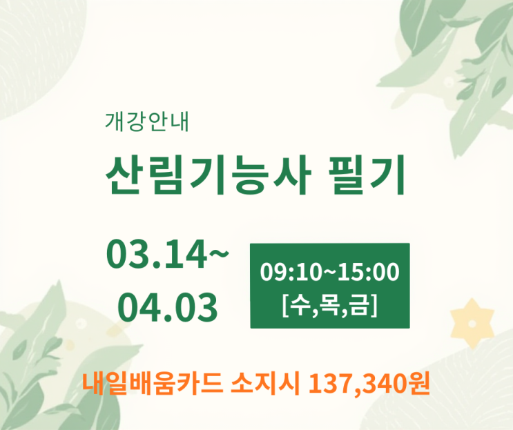 최근 환경과 자연에 대한 관심이 높아지면서 산림 분야 전문 인력의 중요성도 점점 커지고 있습니다. 산림은 단순히 나무가 모여 있는 공간이 아니라 기후 조절, 수자원 보호, 생태계 유지, 휴식 공간 제공 등 다양한 역할을 하는 중요한 자연 자원입니다. 이러한 산림을 체계적으로 관리하고 보호하기 위해 필요한 국가기술자격이 바로 산림기능사입니다. 산림 분야에 관심이 있거나 자격증 취득을 준비하는 분들을 위해 산림기능사 필기 대비 과정을 운영합니다. 산림기능사란? 산림기능사는 산림을 조성하고 관리하며 산림자원을 보호하기 위한 기초적인 임업 기술과 지식을 갖춘 전문 기능 인력을 양성하기 위한 국가기술자격입니다. 주요 업....... <img src="https://blogthumb.pstatic.net/MjAyNjAzMDVfMjc0/MDAxNzcyNjkwMTQ0ODE5.CuIeneLSg16PHRRJtnaaMQFav32qcbj3cNQWJxXtlh8g.CdTBzpc09CrfhqfrqM9jbwWLMxhG8V-G-KCXWhodvCcg.PNG/Promotional_Poster_for_Forest_Technician_Course.png?type=s3" />