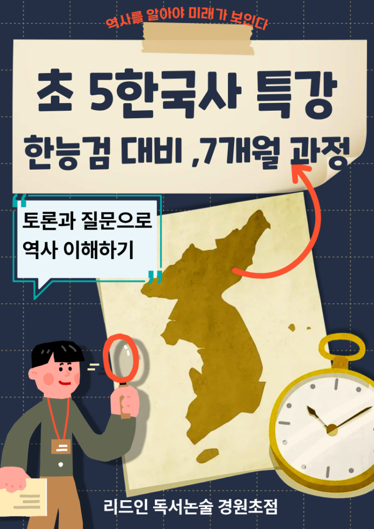 안녕하세요. 작년 2학기부터 올해 초까지 초등학교 5학년 학생들을 대상으로 한국사 특강 7개월 과정을 진행했습니다. 단순한 역사 지식 전달이 아니라, 논술과 함께 사고하며 역사를 이해하는 수업을 목표로 시작한 과정이었습니다. 처음 수업을 시작했을 때만 해도 아이들에게 한국사는 다소 낯설고 어려운 과목이었습니다. 그래서 수업에서는 이야기 중심의 역사 설명과 질문 중심의 토론, 그리고 간단한 글쓰기 활동을 함께 진행했습니다. 특히 논술학원 수업의 장점을 살려 “왜 그런 일이 일어났을까?” “나라의 입장에서 어떤 선택이 더 좋았을까?” 같은 질문을 던지며 생각해 보는 시간을 많이 가졌습니다. 아이들은 점점 역사 속 인물....... <img src="https://blogthumb.pstatic.net/MjAyNjAzMDZfMTE5/MDAxNzcyNzgxMzYyNDMw.D766-BUaeeB8cbcIjvfwHH5gSOg7O08VAjxGhwbkgIQg.QBHnRB8Lx2j6rrBUE2qt4zwOC0Zaiie2lW2_0owPxPwg.PNG/1111.png?type=s3" />