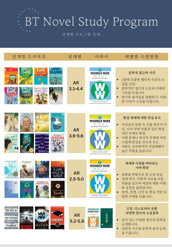 안녕하세요. 터치잉글리시 영어학원입니다. 그동안 문의 주셨던 온라인 원어민 소설 수업을 오픈합니다. 원서를 읽고 이해하고 이야기 나누고 롸이팅까지 함께 진행하는 수업입니다. 원서 온라인 정독수업 질문과 토론 그리고 쓰기로 연결되는 수업 아이들 속도에 맞춰서 진행되는 소수 정예 낭독 토론 중심 Zoom 라이브 수업입니다. 뉴베리 수상작 부터 BT Novel 소설라인업으로 진행됩니다. 눈으로만 읽는 독서와 입으로 소리내어 읽는 독서는 뇌 활성화 정도부터가 다르죠. 시각 , 청각, 운동지각을 동시에 깨워 뇌 전체를 활용하는 낭독의 힘 !!!! 영어책 노블수업을 학원에 가지 않고 가정에서 학습 할 수 있습니다. 2월 부터 오픈 되는 수....... <img src="https://blogthumb.pstatic.net/MjAyNjAyMDRfMTMw/MDAxNzcwMTYyMjgzMTMx.Rd9-ttSu2DkMhzXjlZxVjrq8_HQzqNfEen0c6FNlbqMg.Mc1dADrev0omBnNOICVqgEsY59G8H2vpv8OS9Gqezaog.PNG/%C8%AD%B8%E9_%C4%B8%C3%B3_2025-12-17_070142.png?type=s3" />