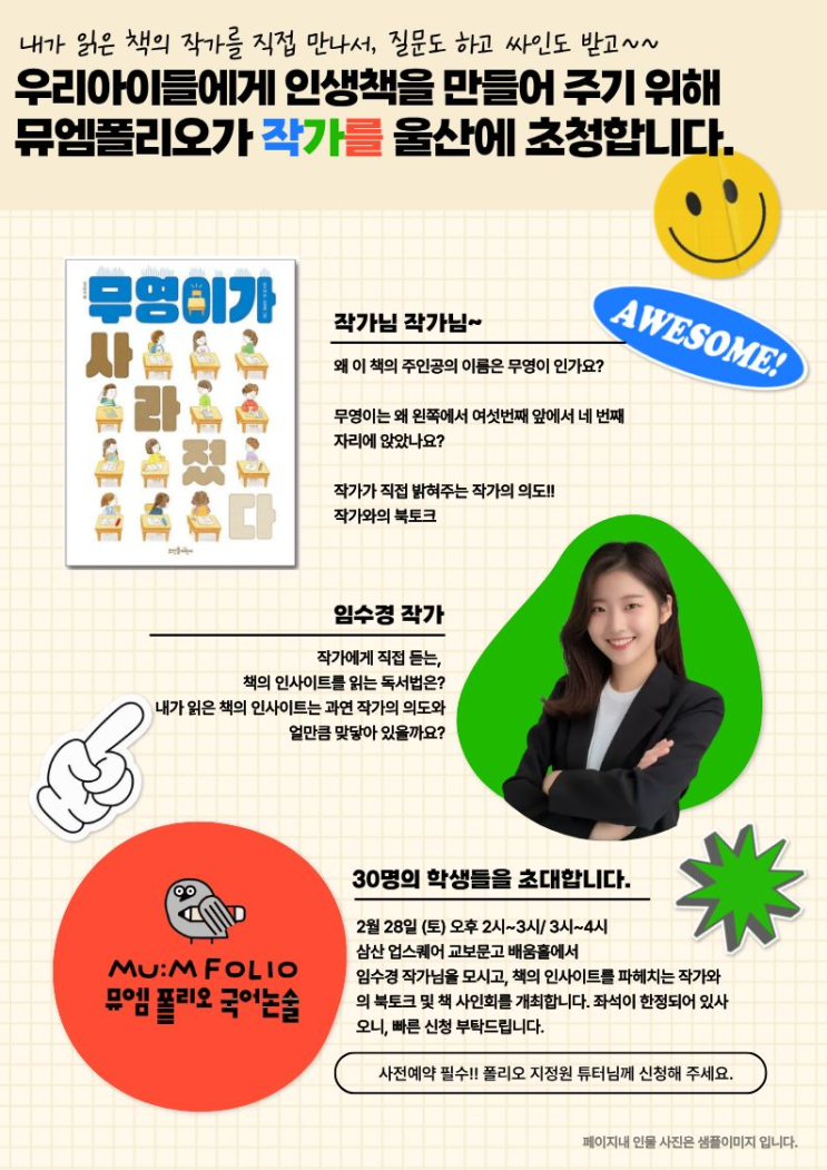 한 권의 책에 담긴 세계가 모두 내 것이 되는 독서 뮤엠 FOLIO 현재 수강 중인 우리 뮤둥이에게 작가와의 북이 토크의 경험으로 평생 기억에 남을 인생 책을 만들어 주는 날!! 2/28일 울산교보문고에서 무영이가 사라졌다의 임수경 작가를 바로 눈앞에서 만나고 책에 대한 질문도 직접 해보고 싸인까지 받는 날!! 모이자!! 배움 홀 2시~3시 3시~4시 신청해 주세요!! <img src="https://blogthumb.pstatic.net/MjAyNjAyMDZfMjcz/MDAxNzcwMzc3MTc0MTMx.--hDeggHtShhf-xib8s-kls8uV9xOnNw2rMG18d1oikg.hq82aaicroOER993N21xN1a9FrZBCu-fBNmtnKJalpog.PNG/image.png?type=s3" />