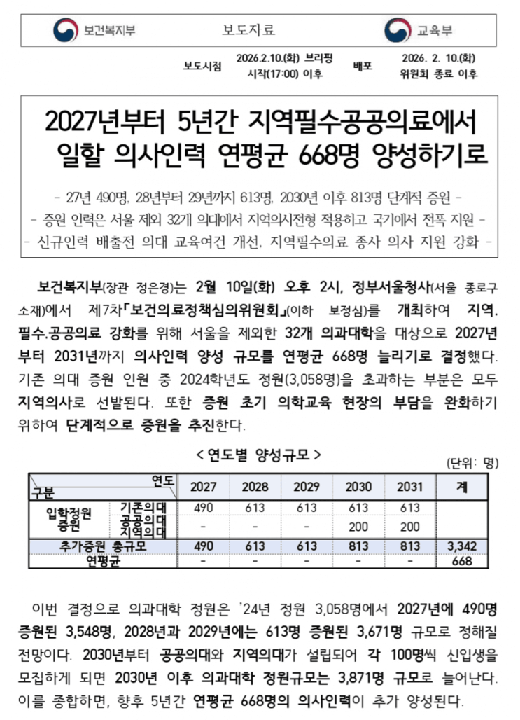 요즘 학부모님들께 가장 많이 받는 질문이 바로 이것입니다. “의대 정원 늘린다는데, 그럼 진짜 기회가 커진 건가요?” 결론부터 말씀드리면, 상황은 아직 정리되지 않았고 ‘변수’가 많습니다. 아래에서 핵심만 차분히 설명드리겠습니다. 1. 정부는 2027학년도부터 의대 정원을 단계적으로 늘리겠다고 공식 발표했습니다. 연평균 약 668명 증원 서울을 제외한 전국 32개 의대 대상 지역과 필수&공공의료 강화를 명분으로 제시 2030년 이후에는 공공의대·지역의대 신설까지 포함 정부 입장: 의사 수를 늘려 지역과 필수의료를 살리겠다 <보건의료정책심의위원회 보도자료> 2. 의사협회는 강력하게 반발하고 있습니다. 대한의사협회는....... <img src="https://blogthumb.pstatic.net/MjAyNjAyMTFfMTIz/MDAxNzcwNzY5ODE0Nzc1.WEW28RyBsaPk7KXoPrvMUzlVrDDj77k5BH2dbbhTvYcg.oOfgAmbWLG8UinrsropJR0gVtMtbKo0xgihyDdaGr1Qg.PNG/KakaoTalk_20260210_174624675.png?type=s3" />