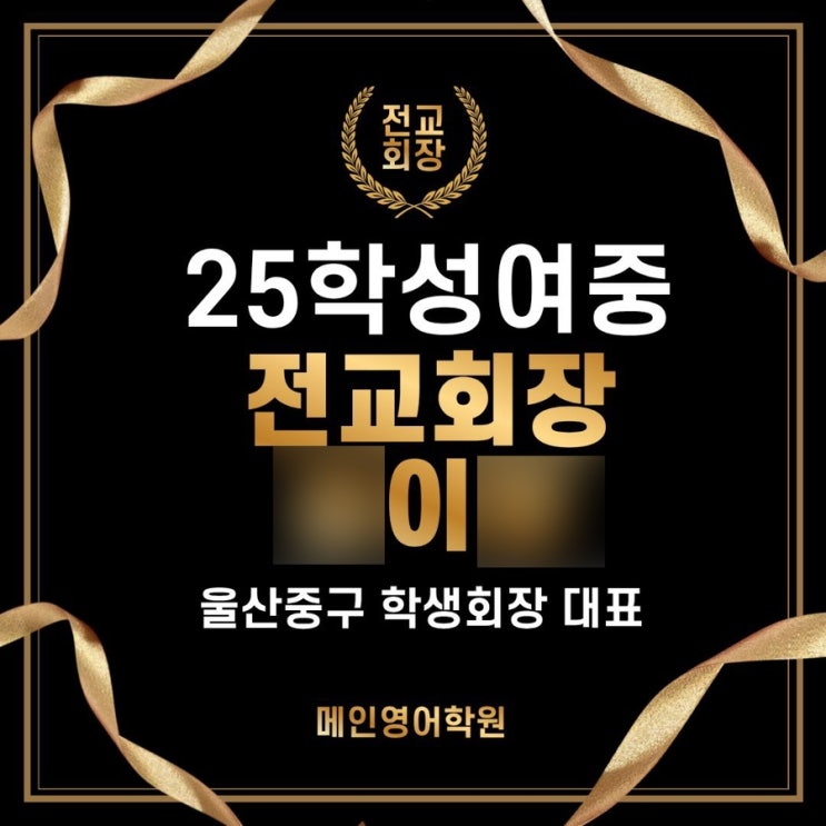 개인정보공개 동의 하에 게시하였습니다 25년 학성여중 전교회장 김** 울산 중구 학생회장 대표 역임 자랑스러운 메인영어학원 학생입니다 (25년 학성여중 공동1등으로 졸업한 박**, 허** 학생도 자랑스러운 메인학생입니다) <img src="https://blogthumb.pstatic.net/MjAyNjAxMjhfMTU2/MDAxNzY5NTU4MjkzNTQy.u5NYrwRJx9KqugGlj0PZAh7RYnYbm935eMiWE77j_7sg.-k-GmI9CQ-9b5mWVC9UUgodrLZqyf9wY288KjmXAFpsg.JPEG/output%A3%DF2592806007.jpg?type=s3" />