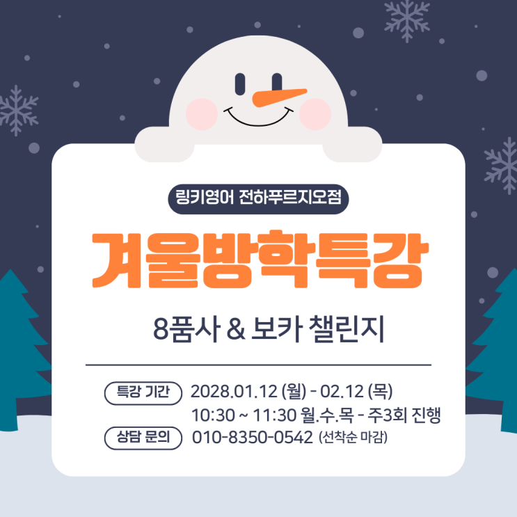 2026학년도 예비 초등 - 3/4(수)오픈, 예비 2~4학년 Phonics(파닉스) / 중등부 - 1/12(월) 오픈 신입생을 모집하고 있습니다. 추가적으로 예비초 3,4학년 친구들은 학교 수업 시간과 충돌 되지 않는 3:15~4:15 타임에 Phonics(파닉스) 클래스가 개강강될 예정입니다. :) 관심있으신 학부모님들께서 원으로 전화주셔서 대기 신청해주시면 됩니다 방문 상담 원하시면 전화로 방문 예약 후, 방문해주세요! 감사합니다! <img src="https://blogthumb.pstatic.net/MjAyNTEyMjJfMzAw/MDAxNzY2Mzk0MTQ0MDIx.OJ6GgfJL7mbiU3GEj_dC-Eendsn-zZTNTANm_Yp57lAg.q0NTvbS9geI_FPqmeYAI2U4UadZLQkDALrSWNM5LYxsg.PNG/%C1%A6%B8%F1%C0%BB_%C0%D4%B7%C2%C7%D8%C1%D6%BC%BC%BF%E4_%288%29.png?type=s3" />