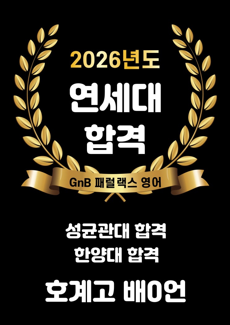 2026년 좋은 소식으로 시작하게 되었습니다 우선 우리 배OO 학생이 초등학교 5학년때부터 만났는데 이제 고등학교를 졸업하네요 항상 바른 인성에 잘생긴 훈훈함까지 겸비했는데 매번 영어시험은 100점을 맞아오던 제자였습니다^^ 이번에 연세대 합격증과 성균관대 합격증 한양대 합격증을 가지고 인사하러 왔더라구요 얼마나 감격스럽던지 아들 대학교 보내는 기분입니다 ☺️ 8년동안 보아왔던 학생의 성장을 바로 옆에서 지켜보니 이렇게 뿌듯할 수 가 없네요 <img src="https://blogthumb.pstatic.net/MjAyNjAyMDlfMjM1/MDAxNzcwNjE4MjIyNjY2.bbGZwSQ-Q0HpwPY_WNYtXwzZEKh3tnzc2YWY2hYGsfsg.QrrZIIAX98ZQTvdMdGEYrLEAeDV3PEehwvFU6Koat0Mg.JPEG/%BF%AC%BC%BC%B4%EB_%C7%D5%B0%DD.jpg?type=s3" />
