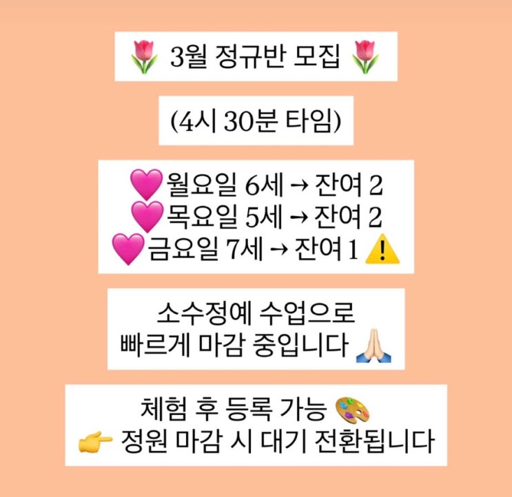 안녕하세요 울산 북구 송정동에 위치한 송정 아트앤하트 미술학원입니다 3월이 다가오면서 정규반 문의가 늘어나 현재 4시 30분 타임 잔여 자리를 안내드립니다. ⸻ ✔ 4시 30분 정규반 잔여 안내 ▪ 월요일 6세 → 잔여 2명 ▪ 목요일 5세 → 잔여 2명 ▪ 금요일 7세 → 잔여 1명 (마감 임박) 소수 정예 수업으로 운영하고 있어 정원이 마감되면 대기 등록으로 전환됩니다 ⸻ 송정 아트앤하트는 이런 수업입니다 저희는 결과 중심 미술이 아닌 아이의 과정 · 표현 · 정서 발달을 함께 바라보는 심리미술 수업입니다 ✔ 관찰력 ✔️ 자존감 ✔ 표현력 ✔ 집중력 ✔ 사회성 이 자연스럽게 자라날 수 있도록 연령별 커....... <img src="https://blogthumb.pstatic.net/MjAyNjAyMjhfMTQ5/MDAxNzcyMjA5MTEwNzQ0.AlTlCzVPPnDsgtqg162PCwuWEyEAZNH_E2_6iOiehowg.UZncnNr0zc2l6rYaRuMgcI-hc_QMY0QlEiJ8Fd9quuQg.JPEG/IMG%A3%DF3427.jpg?type=s3" />