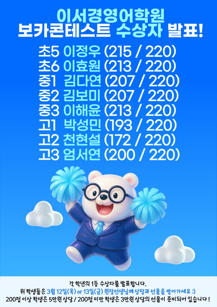 안녕하세요~! 이서경쌤 입니다 :) 지난 겨울방학, 저희 학원의 학생들과 선생님들은 참 뜨거운 시간을 보냈습니다. 방학기간 많은 학습양과 어휘 암기, 특강 수업과 보카콘테스트 참여까지 ! 잘 완주해낸 우리 모두에게 박수를 보냅니다. 그리고, 보카콘테스트 각 학년의 1등 수상자 를 발표합니다. 우리 아이들에게 어떤 선물로 칭찬을할까? 많이 고민을 했는데요. 수상자 선물은 <배달의 민족 상품권>으로 결정했습니다. 선물이 단순 이용권으로 쓰이기 보다는, 가족분들과 함께 맛있는 음식을 먹으며 학업 과정을 공유하고, 우리 아이들이 부모님께 칭찬도 듬뿍 받는 그 순간의 보람과 성취가 아이들에게 큰 선물이 되길 소망해 봅니다....... <img src="https://blogthumb.pstatic.net/MjAyNjAzMDlfNDQg/MDAxNzczMDU0NDQ2NzQz.bk51UAYT8tdWMEuIFRABN3ksHR9jH9gs73SJaG1m3zUg.zRaIxy9BAuhY46562pyELEFpXD6YQFkjklZQjRR-w4Ig.JPEG/%C1%A6%B8%F1%C0%BB_%C0%D4%B7%C2%C7%D8%C1%D6%BC%BC%BF%E4._%2830%29.jpg?type=s3" />