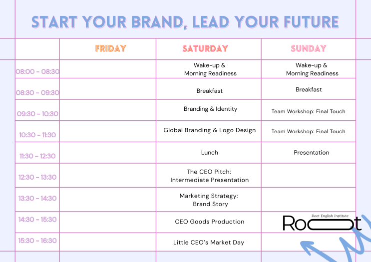 http://pf.kakao.com/_xnxmAxen/chat 안녕하세요, Root English 원장입니다. 초등 고학년 시기는 단순한 영어 학습을 넘어, 자신의 생각을 논리적으로 구조화하고 타인을 설득해 보는 경험이 무엇보다 중요합니다. 이번 여름, Root English는 아이들을 학생이 아닌 Junior CEO(창업자)로 하나의 브랜드를 기획하고 세상에 내놓는 비즈니스 전 과정을 영어로 경험하는 몰입형 캠프를 진행합니다. 운영 인력 및 책임 관리: 원장 전 일정 상주 캠프의 퀄리티는 관리 인력의 밀도와 책임감에서 결정됩니다. 밀착 가이드 학생 36명 정원에 원어민 선생님 3명, 한국인 스태프 3명이 함께합니다. 2개 팀당 2명의 전담 인력(원어민선생님, 한국인 선생님....... <img src="https://blogthumb.pstatic.net/MjAyNjAyMTBfMTgw/MDAxNzcwNjk2MTI4NDQ2.WAn-wePzIzPyT0_V6xuOCaqzRrhRTU8eEuZJZKT3oRkg.2ciWP1h-klNGuh9SahNXMTbxL4rfRLDjS8--paoPuSMg.PNG/image.png?type=s3" />