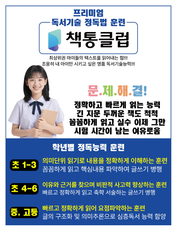 “아이 성적이 노력 대비 안 나온다면… 이유는 따로 있을 수 있습니다.” 초등 때는 티가 잘 나지 않지만 중학교에 올라가면 갑자기 성적이 떨어지는 아이들, 생각보다 많습니다. 상담을 하면서 자주 듣는 이야기입니다. “분명 공부는 하는데 성적이 안 올라요.” “책도 읽는데 이해를 못 하는 것 같아요.” “문제를 제대로 안 읽어서 늘 아쉬워요.” 이럴 경우 단순히 공부량의 문제가 아니라 ⚠️ 읽는 힘(독해력)이 부족하다는 신호일 가능성이 큽니다. 독해력은 모든 과목의 기초라서 지금 놓치면 학년이 올라갈수록 격차가 빠르게 벌어집니다. ✔ 초등 때는 버티지만 ✔ 중학교에서는 성적 차이로 나타나고 ✔ 고등학교에서는 따라....... <img src="https://blogthumb.pstatic.net/MjAyNjAyMTFfMjM3/MDAxNzcwNzkzMzI2MzEx.H7XxxB4dQyijVy2JvPBwtc67UbOcQ6Uwc2mEbM4s6o8g.0rGEcSaWzQqkzv-gBuGxctqdg1sc5rbVRDnzoxLIdHkg.PNG/900%A3%DF1770791826225.png?type=s3" />
