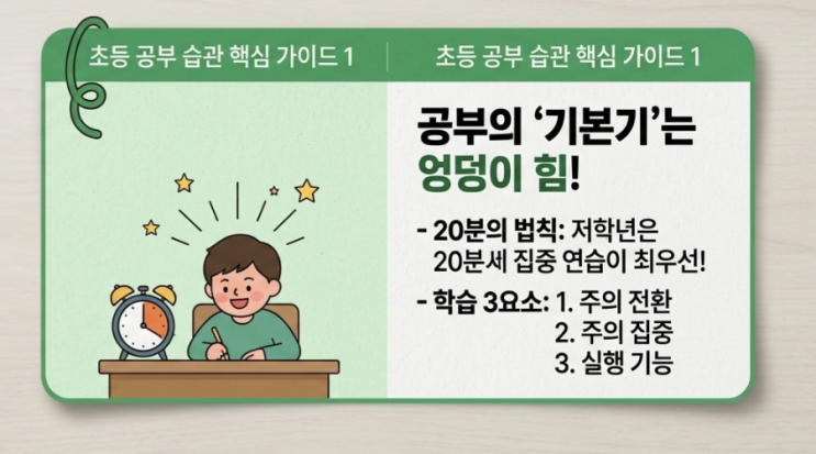 안녕하세요! 오늘은 자녀 교육의 멘토, 아주대 조선미 교수님의 강연 내용을 바탕으로 초등기 자녀를 둔 부모님들이 꼭 알아야 할 학습 습관의 본질에 대해 이야기해 보려고 합니다. "우리 애는 왜 이렇게 공부 욕심이 없을까요?" "학원 숙제시키다 매일 전쟁이에요." 이런 고민을 하고 계신다면, 오늘 포스팅이 큰 전환점이 될 거예요. 1. 1등보다 중요한 건 '20분의 힘' 초등학교 저학년 시기, 가장 중요한 건 무엇일까요? 영단어 암기도, 심화 문제 풀이도 아닙니다. 바로 **'엉덩이 힘'**입니다. 20분 집중 훈련: 저학년 아이에게는 20분 동안 딴짓하지 않고 앉아 있는 연습이 학습의 기본입니다. 주....... <img src="https://blogthumb.pstatic.net/MjAyNjAzMTFfMjMw/MDAxNzczMjQwOTEzNjEx.fekVp2OaSnjYkL5EyVSHuA0bECcjHDbBRHuTcaOuYN0g.2lFvx3l0lhocMmpIlzSvxgcd06nPwmvul_Db7FevkL0g.PNG/900%A3%DF1773240500988.png?type=s3" />