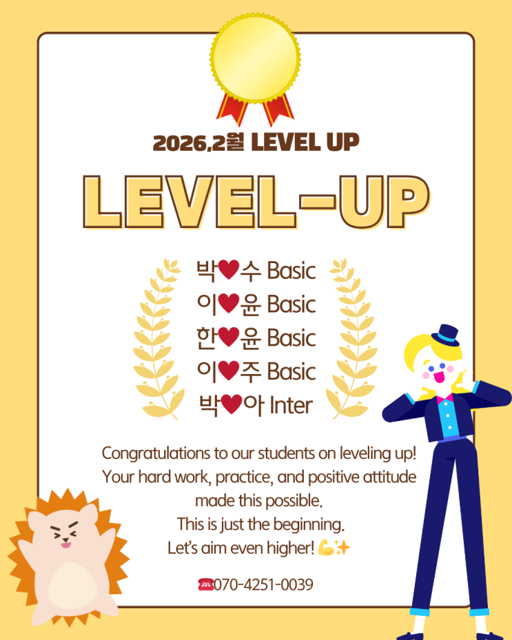 Congratulations Basic 박♡수 Basic 이♡윤 Basic 한♡윤 Basic 이♡주 Inter 박♡아 다음레벨을 향해 Fighting~!!! <img src="https://blogthumb.pstatic.net/MjAyNjAyMDZfMjEy/MDAxNzcwMzcyODQxNTMw.TrrBKPltsM_5gWPDW8WuyVgFdasGpvI8JhSiYuNXj4kg.1r8LYRbXN6ejU2cIGRcLzVlzHB-PJ-8YEwaHSvfv2Ygg.PNG/fpqpfdjq_%281%29.png?type=s3" />