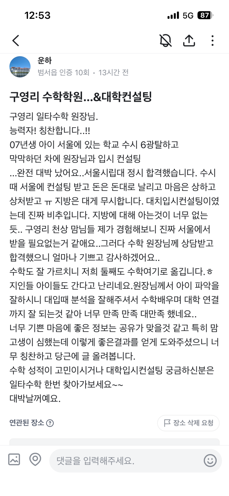 중학생 고등학생 수학을 가르치다 보면 목적은 대학진학이 95%가 넘습니다. 입시는 혼자 하는 싸움이 아닙니다. 학생 혼자, 부모님 혼자, 선생님 혼자서는 결코 완주할 수 없는 긴 여정입니다. 학생이 자신의 가능성을 믿고 자신에게 실망하지 말고 노력하고, 부모님이 아이를 믿고 기다려 주시고, 선생님이 아이의 현재 위치를 정확하게 진단하고 방향을 제시할 때, 그 세 가지가 한 방향을 볼 때 비로소 합격이라는 결과에 다가갈 수 있는 것 같습니다. 이에 구영리 일타수학 교습소는 단순히 문제를 많이 풀리는 곳이 아닙니다. 아이의 성향, 실력, 목표 대학, 현재 상황을 함께 분석하고 부모님과 지속적으로 소통하며 "지금 무엇을 해....... <img src="https://blogthumb.pstatic.net/MjAyNjAyMTFfOTMg/MDAxNzcwODAyNzgyNTQx.TASa5AxC0Uuon12pqUMHXI4iDzs7G7PL7H56CQA-rk0g.aEAjqtuomDpI72WhYNc_J-SOeRLP_jArNwcHsDFVFVMg.PNG/KakaoTalk_20260210_125352842.png?type=s3" />