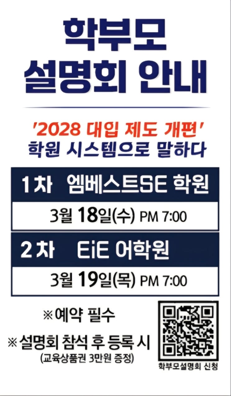 2028 대입 제도 개편, 지금 무엇을 준비해야 할까요? 입시는 단순히 시험 점수의 문제가 아닙니다. 교육과정, 내신 평가 방식, 학생부 구조까지 모두 달라지고 있습니다. 이번 학부모 설명회에서는 “2028 대입 개편 이후, 초·중등 시기에 반드시 준비해야 할 것”을 엠베스트SE & EiE 학원의 실제 운영 시스템을 기반으로 설명드립니다. 설명회 핵심 내용 2028 대입 개편의 실제 변화 고교학점제와 내신 관리 전략 서술형·수행평가 대비 방법 초등 중등 부터 만들어야 할 학습 습관 4년 연속 특목·자사고 합격을 만든 관리 시스템 일정 안내 1차 │ 엠베스트SE 학원 3월 18일(수) PM 7:00 2차 │ EiE 어학원 3월 19일(목) PM 7:00....... <img src="https://blogthumb.pstatic.net/MjAyNjAyMTJfMTg4/MDAxNzcwODgyNjkwNjEw.V9-YoJyyBGUzgMm6m6cXyXCi8scFzQwYFb3TZrIQUrwg.xRcub4fkJa3_rjLEZpktlZBJJ6ImkRzVOQKM_SMosnQg.JPEG/900%A3%DFScreenshot%A3%DF20260212%A3%DF162822%A3%DFGallery.jpg?type=s3" />