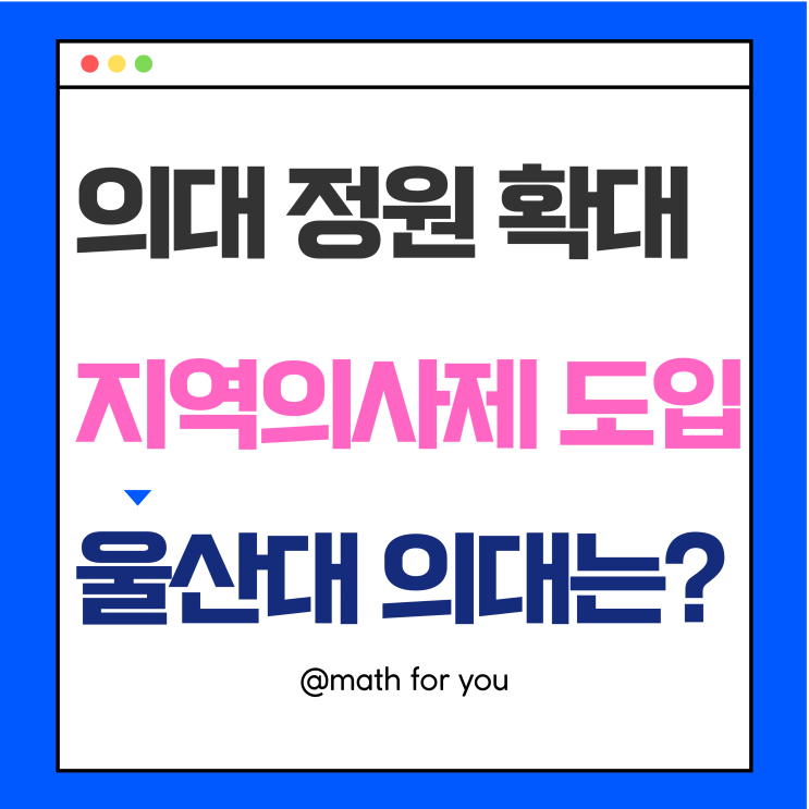 안녕하세요? 차원이 다른 수학 울산 무거동 장검 굴화 수학학원 매쓰포유입니다. 최근 교육부가 의과대학 정원을 단계적으로 확대하겠다는 계획을 발표하면서, 대입을 앞둔 학생과 학부모님들의 관심이 집중되고 있습니다. 이런 소식이 들릴 때마다 의대 진학에 관심이 많은 학부모님들께서는 우리 아이 입시 전략을 어떻게 수정해야 할지 고민 많으실 거라 생각됩니다. 특히 울산에 거주하시는 학부모님들이라면 울산대학교 의과대학 소식에 더욱 귀를 기울이게 되실 텐데요. 오늘은 여기에 관한 포스팅을 해볼까 합니다. 이젠 정원 확대와 기존의 '지역 인재전형' 에서 나아가 '지역의사제'라는 새로운 제도가 입시 판도를....... <img src="https://blogthumb.pstatic.net/MjAyNjAyMjJfMTYw/MDAxNzcxNzQ3NTczMjIz.ySVrYNzir0wZOHLBkYRG_iWpb1tA_cOWP3I_X4kr7RUg.Y0XmwJ7fRDI-aJ7KvPzv0LMAvcAUdm0PgC3o1Do4P-kg.PNG/%BF%EF%BB%EA%B4%EB%C0%C7%B4%EB_01.png?type=s3" />