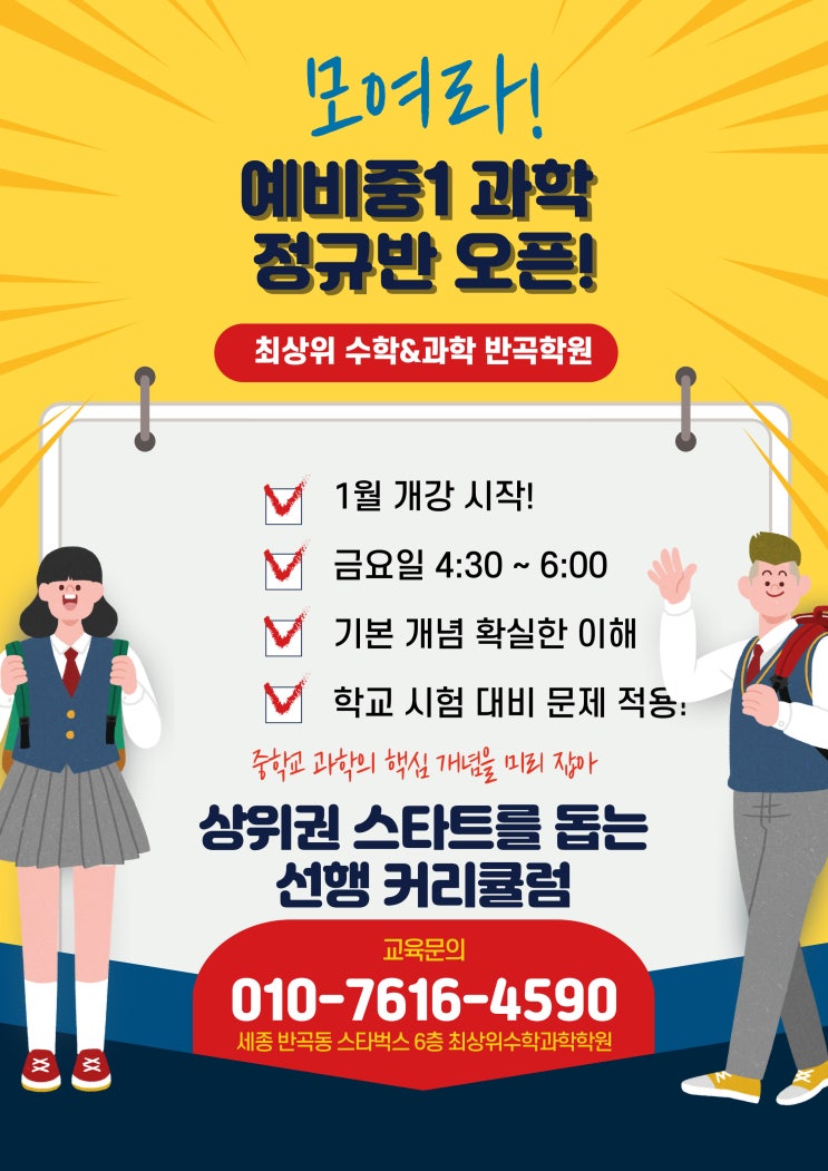 세종 반곡동 과학학원 최상위수학과학반곡학원 – 예비중1·중2 과학반 신규 개설 안내