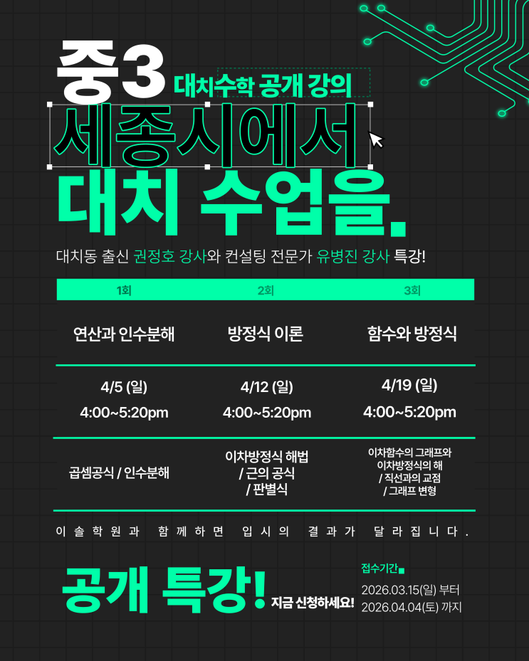 중 3, 이제는 정말 알아야 한다! 이제는 정말 몰라선 안 되는 중3 수학! 대치동 출신 강사가 설명해주는 최고수준의 강의를 무료로! 공개합니다! 학생에 대한 강한 책임감으로 쌓아올린 이솔학원 강사진의 강의력! 그것이 이솔학원의 자부심이기에 자신있게 소개합니다! https://naver.me/51uconBu 지금 신청하셔서 직접 수강해보세요! https://blog.naver.com/esoledu2021/224211539977 자세한 설명은↑↑↑↑↑ <img src="https://blogthumb.pstatic.net/MjAyNjAzMTVfMTE0/MDAxNzczNTUxODM4MjY4.6m30cIxUmL7FvIAjRMdArYnvAfu2fxeCs7yXyxswhtsg.JMzrdo3eic58nQ22ej-dR9RRmKovlBo2HXhzpDSw77wg.PNG/%C1%A6%B8%F1%C0%BB_%C0%D4%B7%C2%C7%D8%C1%D6%BC%BC%BF%E4._%284%29.png?type=s3" />
