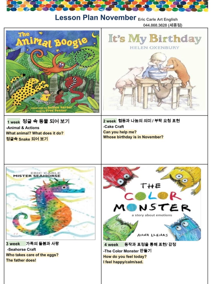 -November Lesson Plan- 이번 달은 아이들이 동물, 생일, 가족, 감정을 영어로 배우며 따뜻한 마음과 표현력을 함께 키우는 시간이에요. 1주차 –The Animal Boogie 정글 속 동물이 되어 신나게 춤춰요! “What animal? What does it do?” 움직임과 리듬으로 영어가 쏙쏙 2주차 – It’s My Birthday 케이크를 함께 만들며 ‘Can you help me?’ 도와주기, 나누기, 부탁 표현을 배워요 3주차 -Mister Seahorse “Who takes care of the eggs? The father does!” 아빠의 사랑과 가족의 소중함을 배우는 감동 스토리 4주차 – The Color Monster 감정을 색깔로 표현해요! “How do you feel today?” 아이들이 직....... <img src="https://blogthumb.pstatic.net/MjAyNTExMDhfMjk5/MDAxNzYyNTY1MzcyNDU3.PUWK1kdQU4OFNCqcZKCl4fUAuhVpukPH2dzqW7gbsFEg.D5s9nwt6rmrD8nl6gQ-5QoxhrNhCoxe66plHAsXY3Qgg.JPEG/68924CBA%A3%AD248D%A3%AD4A8C%A3%ADA19E%A3%AD9AD572DC19EB.jpg?type=s3" />