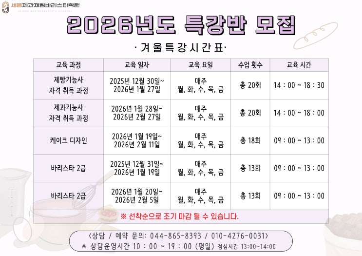 안녕하세요. 세종제과제빵바리스타학원입니다. 2026년 겨울 특강반 제과/제빵/케이크/바리스타2급 자격증 취득 과정이 모집중이니 많은 관심 부탁드립니다:) 댓글, 채팅 답변은 어렵습니다. -상 담 시 간 안 내 - *월,화,수,목,금 : 10 : 00 ~ 19 : 00 (점심시간 : 13 : 00 ~ 14 :00) 입니다 ☎ 044-865-8393 / 010-4276-0031 방문 상담과 등록은 예약제로 운영중이니 오시기전 꼭 연락 부탁드립니다 :) 카카오톡채널 - 세종제과제빵바리스타학원 ↑ 위 링크를 클릭하시면 카카오톡 문의로 바로 연결됩니다. ↑ <img src="https://blogthumb.pstatic.net/MjAyNTExMTRfMTQ5/MDAxNzYzMDg4MDQ0NTE0.OuEYY_NMXuLjq74N7W0oDMNtpc-5fBScK9iJvA1bdFcg.BuOXVUl051gL5xOoeRECtsYKsyE2AvcC64ufdvL5Oz4g.JPEG/%B9%E6%C6%AF_%B1%DD%BE%D7X.jpg?type=s3" />