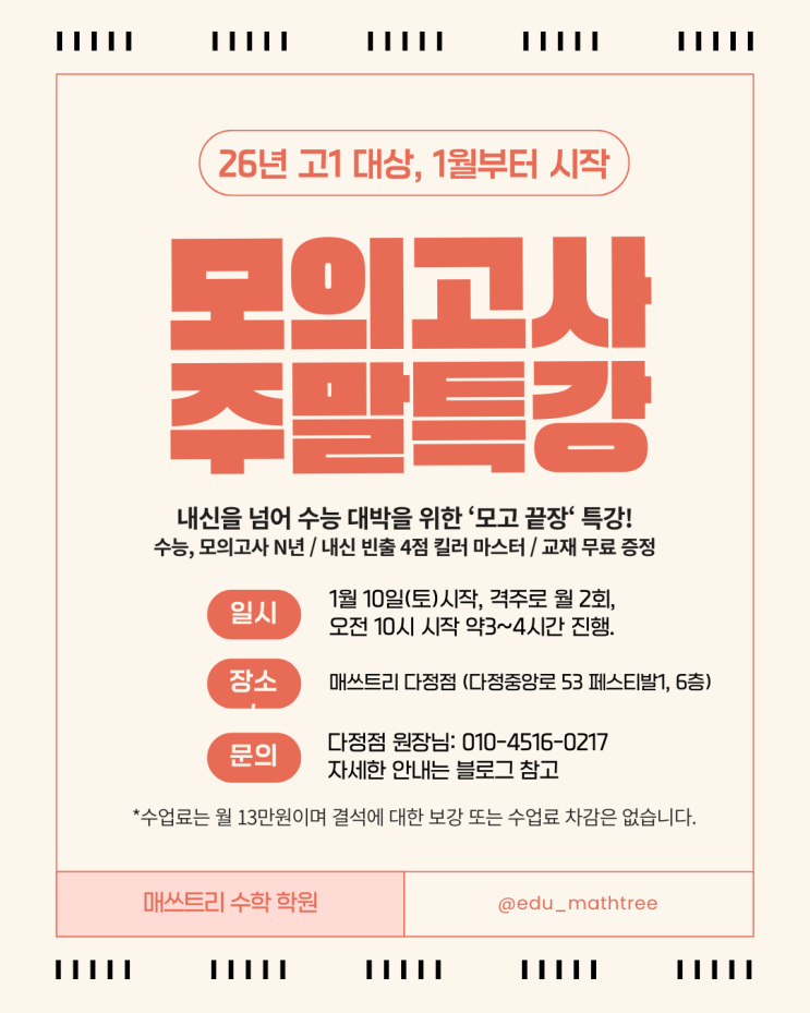 매쓰트리 다정점에서 1월10일부터 고1대상 격주 주말 모의고사반이 운영됩니다. 관심있는 학부모님의 많은 문의 바랍니다. 1. 지도 선생님: 다정점 6년 차, 고3까지 수년간 지도해 주신 남자 선생님 2. 한 번 수업 때 N년차 모의고사 1~2개 마스터 목표 3. 심화, 킬러 문항 등의 완벽한 풀이 진행 *7명의 학생이 모이면 시작 확정! 감사합니다:) <img src="https://blogthumb.pstatic.net/MjAyNTEyMDNfNTQg/MDAxNzY0NzM3MjExMjIw._HvEW_7isY8EUeHE0djAZBtzCplrxkY3QnqH8LkEA9cg.JO7Yt6epWxCZDKpN469huHBnF8uUGkf1H5Cag-dinQwg.PNG/%B4%D9%C1%A4%C1%A1_%C1%D6%B8%BB%B8%F0%C0%C7%B0%ED%BB%E7_%C6%AF%B0%AD.png?type=s3" />