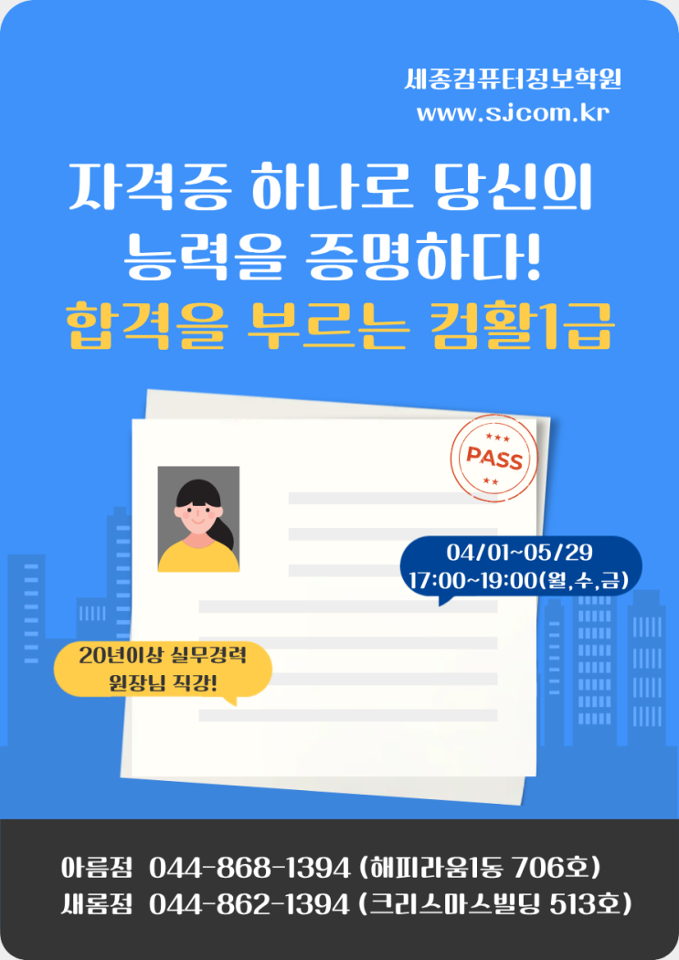 안녕하세요~ 세종시 컴활 전문교육기관 세종컴퓨터정보학원입니다^^ 취업 시장은 점점 더 치열해지고, 기업은 '당장 실무에 투입 가능한 인재' 를 원합니다. 수많은 자격증 중에서도 컴활 1급이 독보적인 위상을 차지하는 이유가 바로 여기에 있습니다. 단순히 "컴퓨터를 할 줄 안다"는 수준을 넘어, 복잡한 데이터를 다루는 전문성을 증명하기 때문입니다. 많은 분이 2급과 1급 사이에서 고민합니다. 하지만, 확실한 차별화를 원한다면 정답은 1급입니다. 엑셀의 고급 함수와 VBA 활용은 물론, 데이터베이스 설계 능력까지 갖추게 됩니다. 이는 곧 업무 자동화와 효율적인 데이터 관리 능력을 의미합니다. 국가기술자격증으....... <img src="https://blogthumb.pstatic.net/MjAyNjAzMTNfMjEw/MDAxNzczMzY5NTY0OTg5.w7aKaoXiNqgalq11pE5CL3Snd9R_p5Obl1LcqfgjBqkg._K7QdhU5MQH_qUfAaSMjjcwaO_C9yQ1RNJF_IsJ7RUMg.PNG/%C4%C4%C8%B01%B1%DE_%2811%29.png?type=s3" />