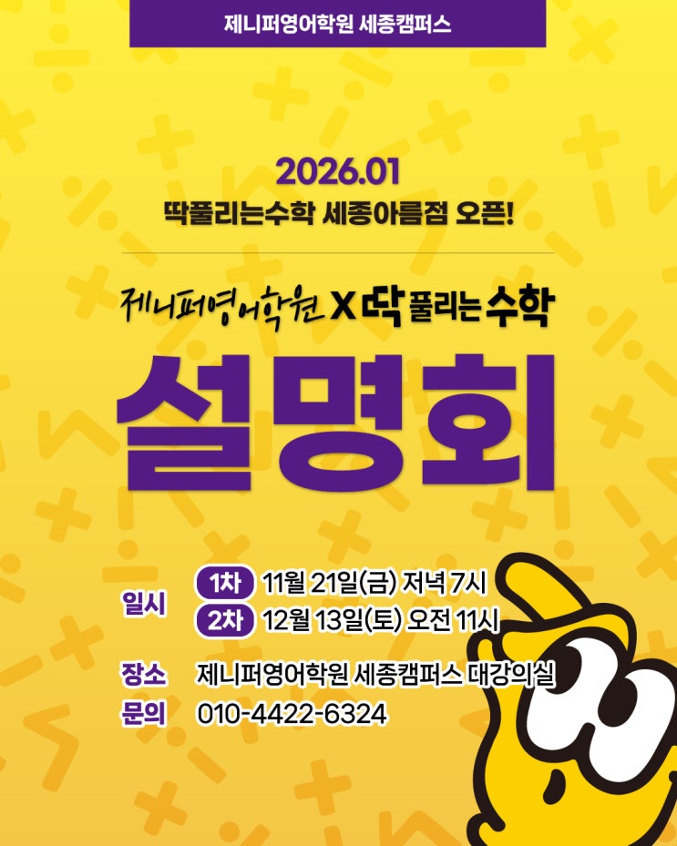 안녕하세요 여러분 제니퍼영어학원 세종캠퍼스입니다 ! 오늘 가져온 소식은 바로!! 초등 수학 OPEN 소식입니다!! 2026년 1월부터 딱풀리는수학(초등) 세종아름점이 새롭게 오픈합니다! (❁´◡`❁) "초등 수학" 및 "초·중등 영어" 프로그램 설명회를 아래와 같이 진행하오니, 많은 관심과 참여 부탁드립니다. (1차)설명회: 11월 21일(금) 저녁 7시 > 진행 완료! (2차)설명회: 12월 13일(토) 오전 11시 ★장소: 제니퍼영어학원 세종캠퍼스 대강의실 ★문의: 010-4422-6324 설명회 참석 시, 많~은 혜택을 받으실 수 있습니다. ╰(*°▽°*)╯ 이번 설명회를 통해 우리 아이 영어&수학 학습 방향을 함께 고민하는 뜻 깊....... <img src="https://blogthumb.pstatic.net/MjAyNTExMjlfMjY1/MDAxNzY0NDE0NTk5MjM0.1src8qpLluObV_9H4wreiJ-i_GCC-l6ub0tQxqR4FwAg.l8F_EgJ6h_2G4_JgjZq_nrfKouEtSsMnJlkkVdWw5uEg.JPEG/2512-1-%BC%BC%C1%BE_%B4%EB%C1%F6_1.jpg?type=s3" />