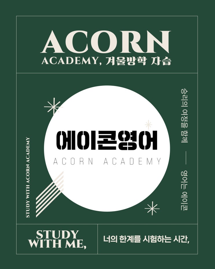 ACORN ACADEMY 겨울방학 오전 자습 관리 특강 “승리의 여정을 함께, 영어는 에이콘” 겨울방학은 누가 더 많이 공부하느냐가 아니라, 누가 더 집중해서 효율적으로 보내느냐가 성적을 가릅니다. 에이콘 영어는 이번 겨울, 학생들이 자신의 한계를 넘어설 수 있도록 오전 자습 관리 특강 프로그램을 준비했습니다. 아침 9시부터 12시까지, 단 3시간. 하지만 이 3시간이 학생들의 방학을 완전히 바꿔놓습니다. 흐트러지는 방학 루틴을 잡고, 공부 습관을 단단히 만들기 위한 가장 효과적인 시간대이기 때문입니다. 왜 ‘에이콘 영어 자습 특강’인가요? ✔️ 집중이 되는 스터디카페형 자습 환경 ✔️ 휴대폰 제출 & 자리 이탈 금지....... <img src="https://blogthumb.pstatic.net/MjAyNTEyMDVfNTAg/MDAxNzY0OTQzNjA0OTE4.vis_Dfjv8WTRf8tUylCwjkqVPGipSNSi6pBQZtyzwjIg.seo0sw9VB_iDEhUGGcr9yXW_h6Cw7UBNXGs3dJ74UDEg.JPEG/1.jpg?type=s3" />