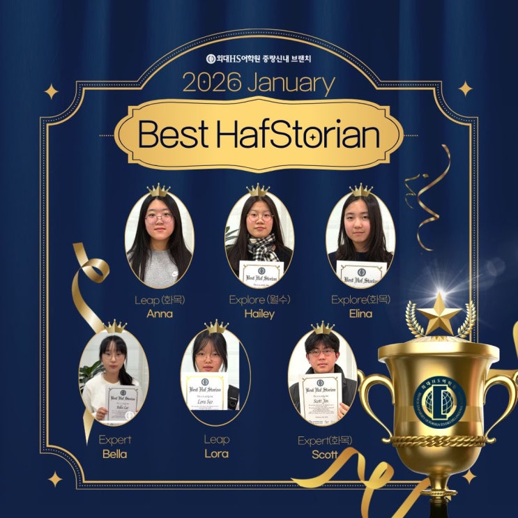 Best HafStorians for this month are Lora, Hailey, Elina, Anna, Scott, Bella 안녕하세요! 외대HS어학원 중랑신내 브랜치입니다. 저희 학원은 매 월 담당 선생님들께서 직접 Best HafStorian(우수 학생)을 뽑는데요. 이번에는 1월 중등부 우수 학생들을 소개할 거예요~ 소개에 앞서 Best HafStorian으로 선정된 친구들! 진심으로 축하합니다 1월 너무 너무 잘해줬어요 ( •̀ ω •́ )✧ Leap 화목 - Anna Seong 이번 1월 Leap (화, 목) Class의 Best HafStorian은 바로 성예원 Anna 입니다 ! 이번 한 달 동안 예원이를 곁에서 지켜보며 선생님은 참 대견하다는 생각을 많이 했어요. 때로는 지치는 날도 있었겠지만 예원이는 단....... <img src="https://blogthumb.pstatic.net/MjAyNjAyMDRfMzEg/MDAxNzcwMjA0ODM2NTA1.wmstQDQ8Kd8cJ9dLUHpmSifrGOpFk5O3kEFgcY1vFygg.SeARBj989xwpcfzE_WfQRMPVE-XL9s2wvpYwyrrGkxUg.JPEG/01%BF%F9_%BA%A3%BD%BA%C6%AE_%C7%D5%BD%BA%C5%E4%B8%AE%BE%F0%28Best_HafStorian%29_%B4%EB%C7%A5_%BB%E7%C1%F8-.jpg?type=s3" />