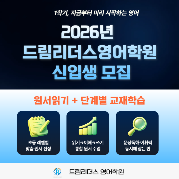 소담동 초등 영어학원, 원서읽기+단계별 교재로 시작하세요 드림리더스 초등 신규모집 안내 영어를 못한다기보다는, 문장을 읽는 힘이 부족한 것 같아요 초등 학부모님들이 가장 많이 하시는 고민이에요. 단어는 외우고 문제집도 푸는데… 문장이 조금만 길어지면 아이가 눈으로만 훑고 넘어가거나 읽어도 “무슨 말인지 모르겠어”라며 손을 놓아버리거나 책을 펼치는 시간보다 영상 보는 시간이 훨씬 많아지는 모습… 이럴수록 “지금부터라도 제대로 읽는 힘을 만들어 줘야겠다”는 마음이 커지지요. 드림리더스는 그 해답을 ‘원서읽기’와 ‘단계별 교재학습’을 함께 설계하는 방식에서 찾았습니다. 그래서 이번에 초등 전 학년 대상 신규....... <img src="https://blogthumb.pstatic.net/MjAyNjAyMDlfMjE1/MDAxNzcwNTY0MzI5NDkz.X5WcurSDW9gojQhdKlX0tHVcSUi0CP5CftQ-m0sc-mUg.f840rD6pitt2Rc2eO2cqZ9INz_NRKm6BriebrEghAlUg.PNG/%B5%E5%B8%B2%B8%AE%B4%F5%BD%BA%BF%B5%BE%EE_%BA%B9%BB%E7%BA%BB-009_%281%29.png?type=s3" />
