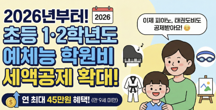 안녕하세요 ! 다인쌤 입니다☺️ 최근 반가운 소식이 전해졌습니다. 2026년부터 초등학교 저학년(1학년~2학년)의 예체능 학원비도 교육비 세액공제 대상에 포함됩니다. 그동안은 유치원생까지만 학원비 공제가 가능했지만, 이제는 초등 저학년 자녀의 피아노.미술.태권도.발레 등 에체능 학원비도 연말정산 시 공제 혜택을 받을 수 있게 됩니다. 왜 예체능이 중요할까요? 초등 저학년 시기는 집중력과 습관 형성이 이루어지는 중요한 시기입니다. 피아노는 ✔️악보를 읽으며 사고력을 기르고 ✔️양손을 동시에 사용하며 두뇌 자극을 돕고 ✔️한 곡을 완성하며 성취감을 배웁니다. 단순 취미 활동을 넘어 아이의 기초 역량을 다지는 교....... <img src="https://blogthumb.pstatic.net/MjAyNjAyMTlfMjM3/MDAxNzcxNDgwMTI0NTE0.yMWsX1j2vRtc5e_n06nEgB8Md_c22ulZFFZzlZwGyv4g.StypTgdC-f7rHnobw6Wx4LUMCAtSoiFaTdvosYsdsUQg.PNG/image.png?type=s3" />