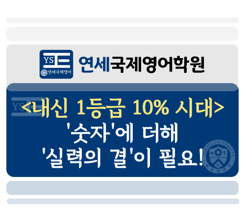 세종 NO.1 영어학원 연세국제영어학원입니다. 최근 2025학년도부터 시행된 내신 5등급제 소식에 학부모님들과 학생들이 걱정이 많아졌습니다. 1등급의 문턱이 4%에서 10%로 넓어지면서, 이제 상위권 입시의 핵심은 '숫자' 그 이상의 무언가를 보여주는 싸움이 되었습니다. 연세국제영어가 그 돌파구를 안내해드립니다! 과거 9등급제 시절의 1등급(4%)은 그 자체로 압도적인 성취를 의미했습니다. 하지만 이제는 한 반에 서너 명씩 1등급이 나옵니다. 대학은 이제 단순히 "1등급인가?"만을 묻지 않습니다. 똑같은 1등급들 사이에서, '누가 더 깊이 있게 공부했고, 그 과정을 증명했는가?' 를 봅니다. 이제 성적표의....... <img src="https://blogthumb.pstatic.net/MjAyNjAxMjJfMjcy/MDAxNzY5MDgxNzgzNzQ2.8WD6jHg_KBYOyMOEQfZgol_UA4s5hMvc79Xx7RSarNAg.j0ALVaUs1odAZtvVonTMHHV6ZUF3FEfHwsFCqFHmzWgg.PNG/%BC%B3%B8%ED%C8%B8_%C7%E0%BB%E7_%B1%E2%C5%B8-%BD%E6%B3%D7%C0%CF-003_%281%29.png?type=s3" />