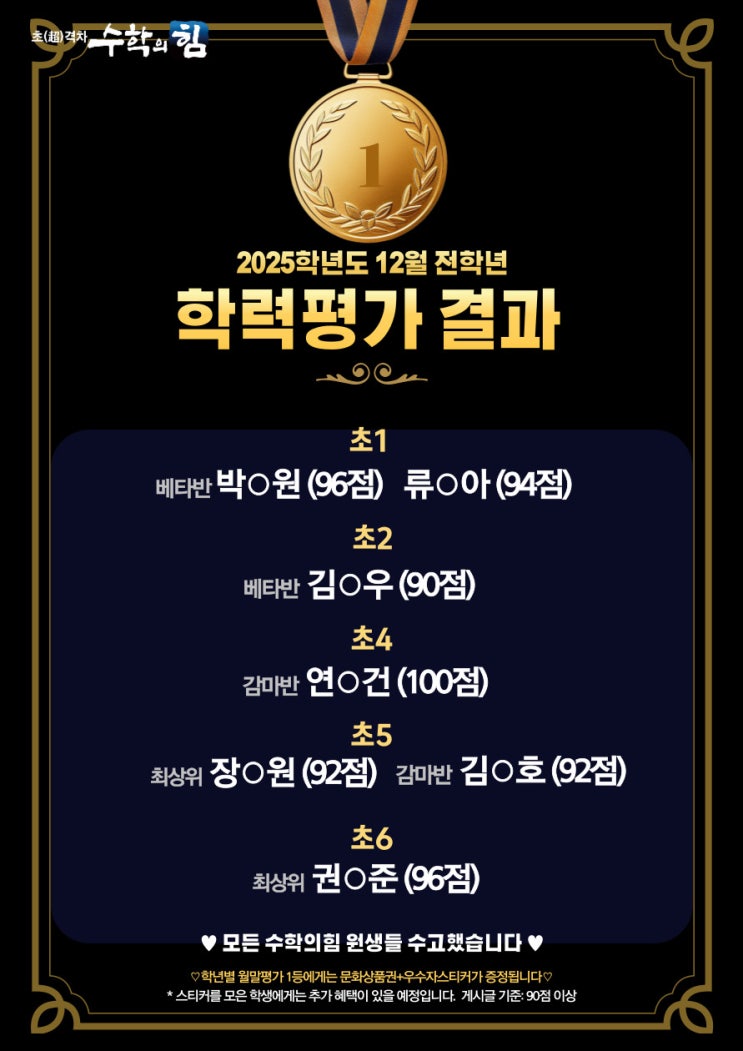 안녕하세요! ♥ 세종시 초중등 수학학원 ♥ 수학의힘 세종소담캠퍼스입니다 ;) [ 2025년 12월 학력평가 결과 안내 ] 지난 한 학기 동안의 학습 결과를 점검하고 학생들의 실력을 객관적으로 분석하기 위해 저희 학원에서는 2025년 12월 학력평가를 진행하였어요~ 이번 평가는 단순한 점수 경쟁이 아니라, 학생 각자의 강점과 약점을 진단하고, 앞으로의 학습 방향을 세우는 데 큰 의미가 있었습니다. 2025 상반기 학력평가 일시: 2025년 12월 18~19일 대상: 수학의힘 세종소담캠퍼스 원생 전체 범위 : 학년별 수준별 문항 구성 시간 : 초등 45분, 중등 1시간 그럼 결과보러 가보실까요? 90점이상의 우수 친구들의 결과입니다 ?....... <img src="https://blogthumb.pstatic.net/MjAyNTEyMjZfMTc1/MDAxNzY2NzI2NzkwMjc5.qOdBIsMqvJZwgVZY7XRRKz8WhAsG_oB8X7hi9yRNVxMg.5xjYSNwjShcXGbQuTuDjy4s6YqOcPTVDLbgDeG0LQf8g.JPEG/%C1%A6%B8%F1%C0%BB-%C0%D4%B7%C2%C7%D8%C1%D6%BC%BC%BF%E4__%BA%B9%BB%E7%BA%BB-_1_-002_%281%29.jpg?type=s3" />