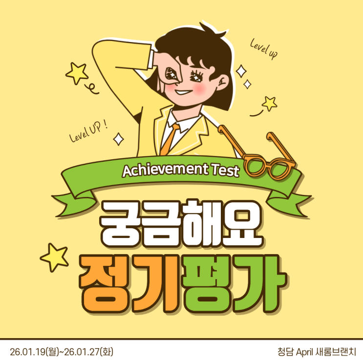 안녕하세요, 청담에이프릴 새롬브랜치입니다. 이번 1월에는 친구들의 실력 향상과 다음 레벨 진학을 위한 정기평가(Achievement Test)가 예정되어 있습니다. 레벨별 변경 사항이 있으니 꼭! 참고 부탁드립니다. 정기평가(Achievement Test)란? 여름학기, 겨울학기에 각 1번씩 진행하는 정기평가로, 학생들의 현재 학습 수준을 정확히 진단하고 다음 레벨로 진급 가능한지를 판단하는 중요한 시험입니다. 정기평가를 반드시 응시해야만 다음 레벨로 진학 가능합니다! 시험 일정 ⭐️1/19(월) ~ 1/20(화)⭐️ Achievement Test (R/L) Seed ~ Junoir Master 레벨 진행 *Junior Master2 레벨은 공인인증시험으로 진행됩니다* ⭐️1/26(월) ....... <img src="https://blogthumb.pstatic.net/MjAyNjAxMDZfMjI1/MDAxNzY3NjgzMTU5NzM1.eIE9aOIzTGOaebZu_6vrayOlSGHXMiBOHw2YJvPn2HUg.qtXdeFha4JupQKnaKntAY-vViFtR5bWQ9hsWbHN7ftgg.PNG/1.png?type=s3" />