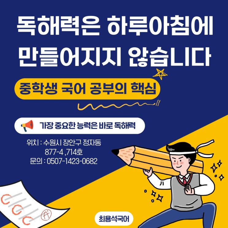 ☞ 최용석국어만의 차별화된 강점 ☜ 입시 국어에서 1등급을 목표로 하는 학생들은 알고 있습니다. 문제를 많이 푼다고 해서 성적이 오르는 것은 아니라는 것을요.. 어느 순간부터 성적이 정체되는 이유는 분명합니다. 실력이 부족해서가 아니라, 자신의 약점을 정확히 모른 채 공부하고 있기 때문입니다. 최용석국어는 바로 그 지점에서 출발합니다. 1등급을 만드는 첫 단계, ‘정확한 약점 진단’ 학생마다 약점은 다릅니다. - 지문은 읽히는데 선택지에서 흔들리는 학생 - 문학 개념은 아는데 작품 적용이 약한 학생 - 문법 개념은 알지만 문제에서 시간 관리가 안 되는 학생 - 독서에서 구조 파악이 느린 학생 겉으로 보기에는 비슷해 보....... <img src="https://blogthumb.pstatic.net/MjAyNjAzMDVfMTE4/MDAxNzcyNzEwMzU5MTEy.YstPJl3dTgV9utE81tLd9btZ2CuQAntphJUq5x9sobQg.SBOUpNLC-tEoh9FEY1DyOHMjB7tkzHbr18LUUj7B7tsg.JPEG/%C1%A6%B8%F1%C0%BB_%C0%D4%B7%C2%C7%D8%C1%D6%BC%BC%BF%E4._%281%29.jpg?type=s3" />